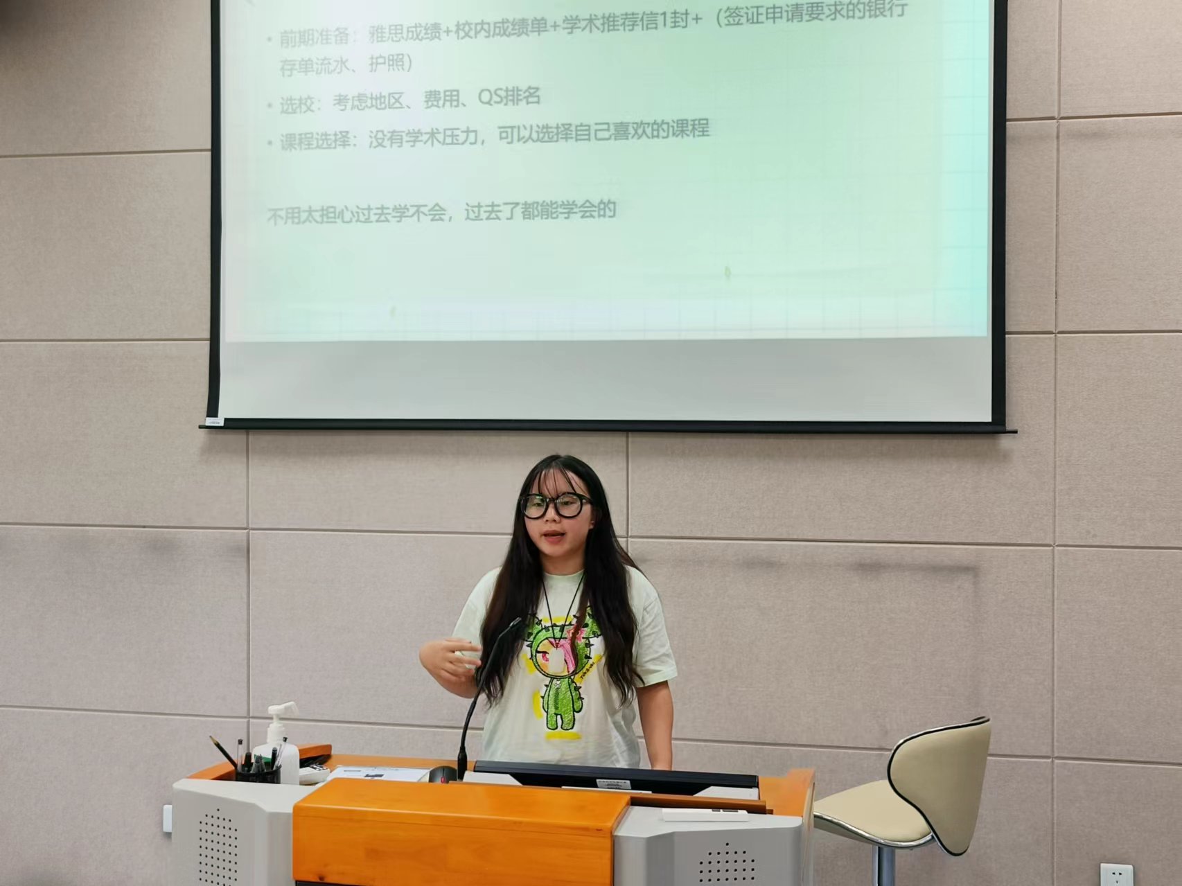 The School of Business has always valued students' overseas exchanges and study progress. Through various activities such as IELTS training camps, English dubbing festivals, global education fairs, study abroad carnivals, and returnee growth talks, the school provides platforms for students. They invite outstanding peers to share their study abroad application strategies and experiences, supporting business students in their overseas study pursuits. It is hoped that through the overseas study sharing session, students will further clarify their personal goals, plan their study paths early, prepare for language exams, participate in high-quality internships or study exchanges, enrich their resumes, and be well-prepared to apply for more prestigious university offers.