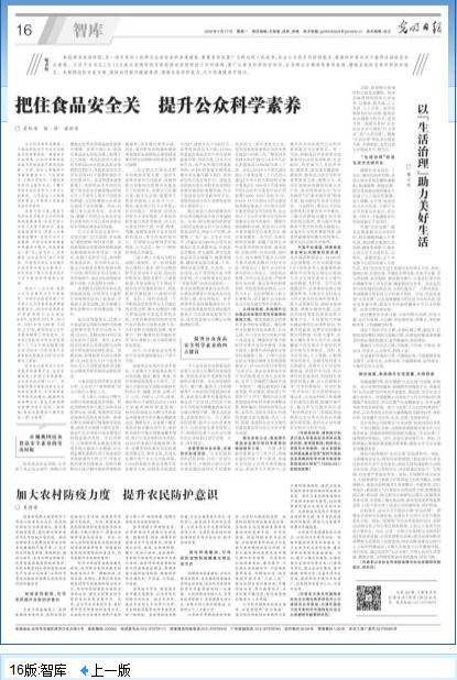 2020年2月17日, 《光明日报》第16版.智库刊发了新葡萄官网吴林海、浦徐进教授等的研究成果《把住食品安全关 提升公众科学素养》一文。这是国家社科基金重点项目“新时代食品安全战略的科学内涵与制度体系框架设计研究”〔19AGL021〕阶段性成果之一。