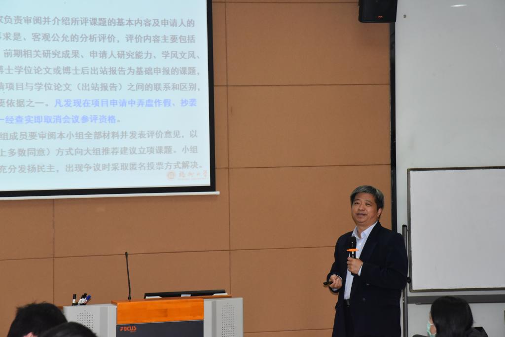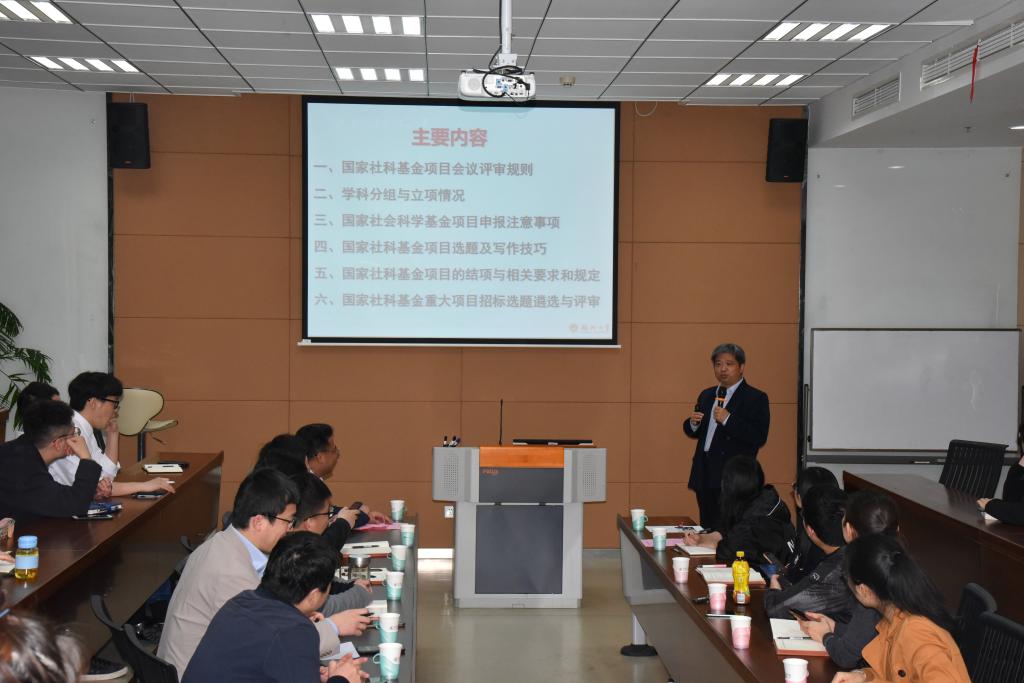 王应明教授围绕“国家社科基金项目会议评审规则”、“学科分组和立项情况”、“国家社科基金申报注意事项”、“国家社科基金项目选题及写作技巧”、“国家社科基金项目的结题于相关要求和规定”、“国家社科基金重大项目招标选题遴选与评审”六大部分,向参会师生系统地介绍了国家社科基金评审、申报和结项的注意事项、主要方法和技巧等内容。王教授在重点介绍“如何设计适合自己研究的选题”时指出选题要紧扣现实需求、要与自己研究领域相关、要贴近理论(学科)前沿、要有全国性意义,选题不仅要新颖,还要满足“学术之需和社会之需”。王教授还从选题依据、研究内容、创新之处、预期成果、研究基础和参考文献等几个方面系统阐述了“如何编写课题论证”,并结合大量案例对各个模块设计、撰写的技巧进行了详实的分析,提出了大量可操性的意见和建议。三个半小时的报告里,王教授诙谐幽默的讲解和独到系统的分析引起了参会师生的广泛共鸣和高度认可。