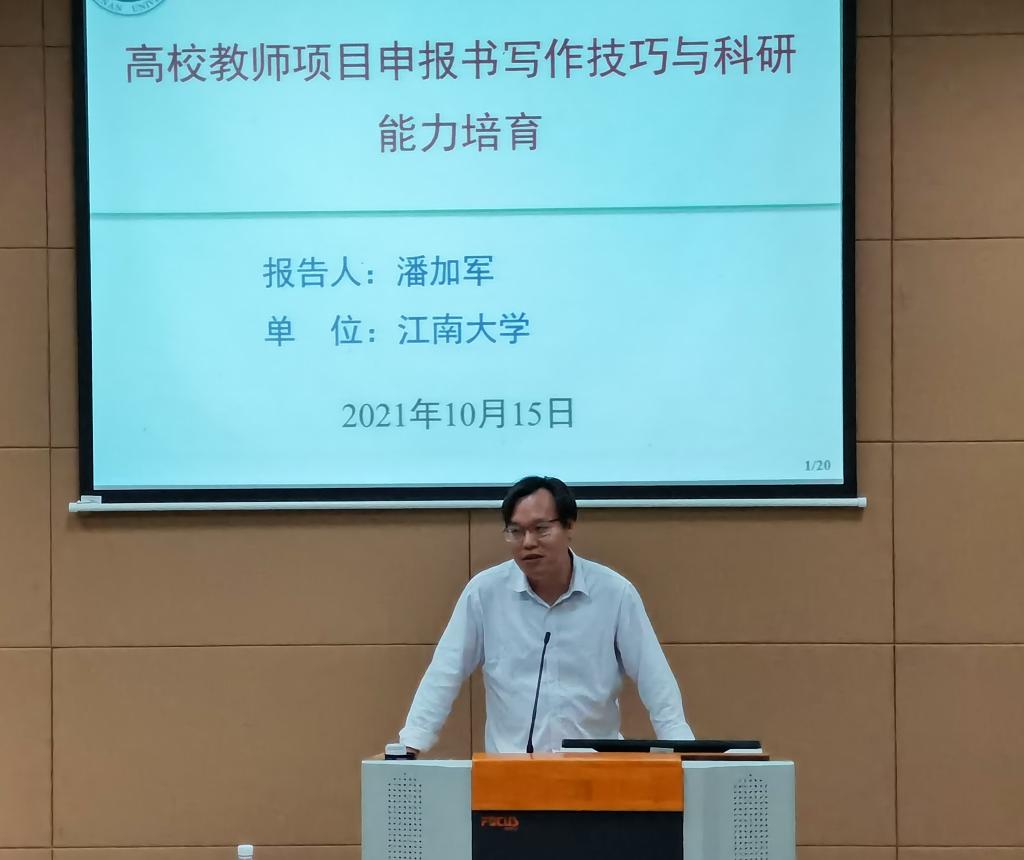 潘加军作题为“高校教师项目申报书写作技巧与科研能力培育”的分享。他介绍了项目申报书涵盖的主要内容,指出项目申报的整体逻辑是有价值-可研究-怎么做-有成果,进而提出选题三部曲:话题-问题-主题,并从研究目标、内容框架、重点难点、研究思路、研究方法、研究计划等方面详细分享自己撰写国社科、教育部申报书的写作技巧。最后,他从积极性和自信心、多写多报多修改、单打独干与团队协作、申报持续性与中标概率等维度,提出了培养科研能力的几点建议。