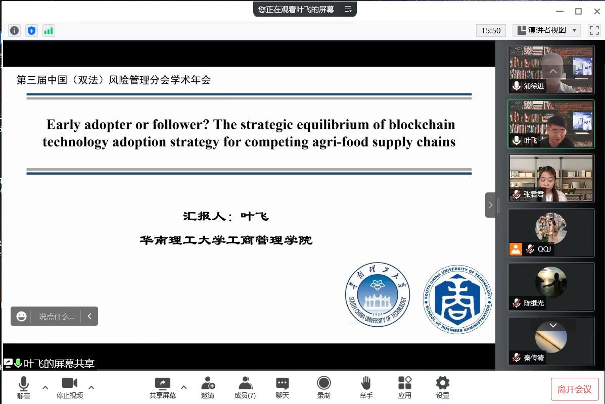 “食品安全风险治理”分论坛由新葡萄8883国际官网院长浦徐进教授担任主席,分论坛邀请了华南理工大学工商管理学院叶飞教授、厦门大学管理学院陈继光副教授、无锡天惠超市股份有限公司张君君董事长、新葡萄8883国际官网浦徐进教授等四位专家、业界人士作为演讲嘉宾,四位专家、业界人士分别以“Early adopter follower? The strategic equilibrium of blockchain technology adoption strategy for competing agri-food supply chains”、“Subsidy for supplier quality management under information asymmetry: process development vs. transparency”、“基于区块链的农产品溯源体系案例研讨”、“我国特殊食品行业发展的特征、问题以及趋势”为题作了精彩的演讲。此次分论坛的举办,不仅为食品安全风险治理领域的学者与业界人士提供了交流平台,也推动了新葡萄8883国际官网对外学术交流工作。