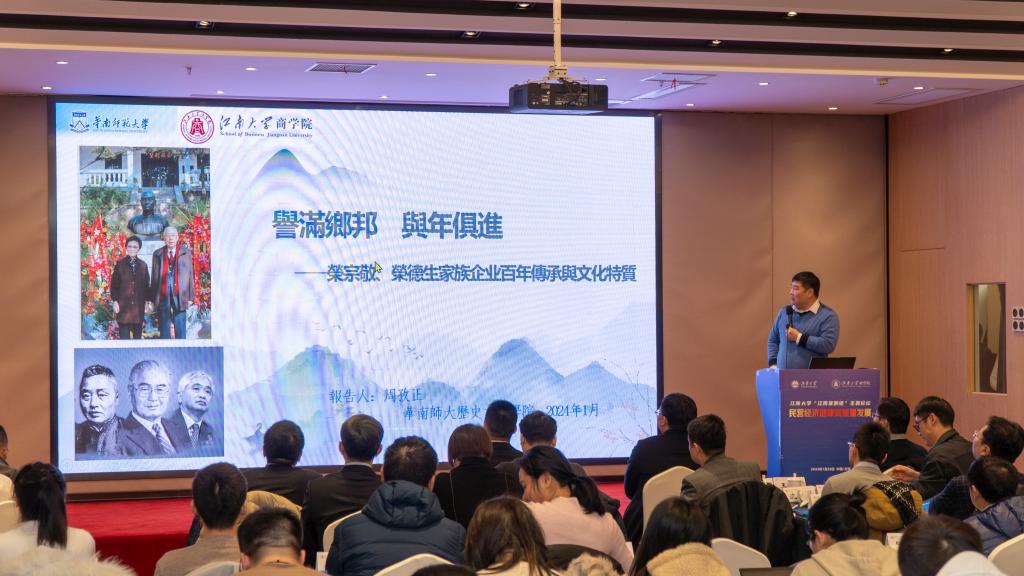 在主题分享环节,华南师范大学历史文化学院硕士生导师,中山大学(管理学院)中国家族企业研究中心研究员周孜正博士带来以“誉满乡邦 与年俱进—荣宗敬、荣德生家族企业百年传承与文化特质”为主题的研究分享。周博士从荣宗敬先生的家族企业文化、荣宗敬和荣鸿庆先生家族企业文化传承的方式及硕果,荣德生和荣毅仁先生家族企业文化传承的方式及硕果等三个维度切入,分析荣氏家族何以实现家族代代传承、家业百年长青。