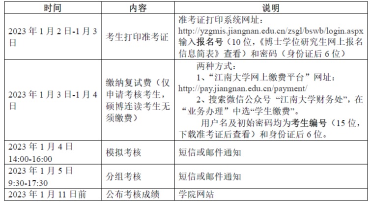 (三)考生参加综合复试需提前准备PPT介绍个人信息及体现个人能力的有关材料(如硕士研究生阶段或同等学力工作期间的科研工作情况和创新点、论文发表情况等)等,汇报时间15分钟左右。为避免复试时因网络或设备等原因分享PPT失败,请2023年1月3日前将PPT发送到学院招生邮箱,邮件地址:huwenliang@jiangnan.edu.cn,邮件标注“XXX申请博士PPT”。如有疑问,可电话咨询新葡萄8883国际官网研究生办公室0510-85329001。