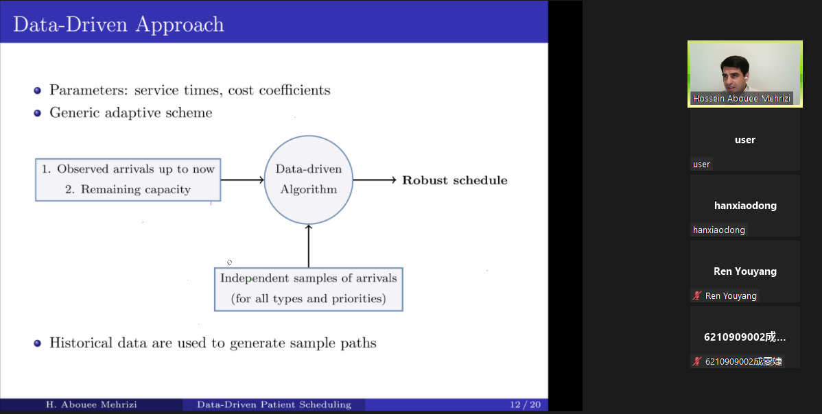 Hossein Abouee Mehrizi教授分别从研究动机、数据收集、数据驱动的模型构建、实证分析等六个方面介绍了其团队一项研究成果。首先,针对考虑患者动态到达的预约调度问题,Hossein Abouee Mehrizi教授构建了分布式鲁棒优化模型,并提出了动态算法来解决该类问题。其中,文中采用一种新的风险度量方法以量化患者到达时间的不确定性。然后,通过利用Ontario医院的磁共振成像数据进行实验,验证了算法的性能。最后提出可进一步设计一种基于需求预测的自适应患者调度算法等研究展望。