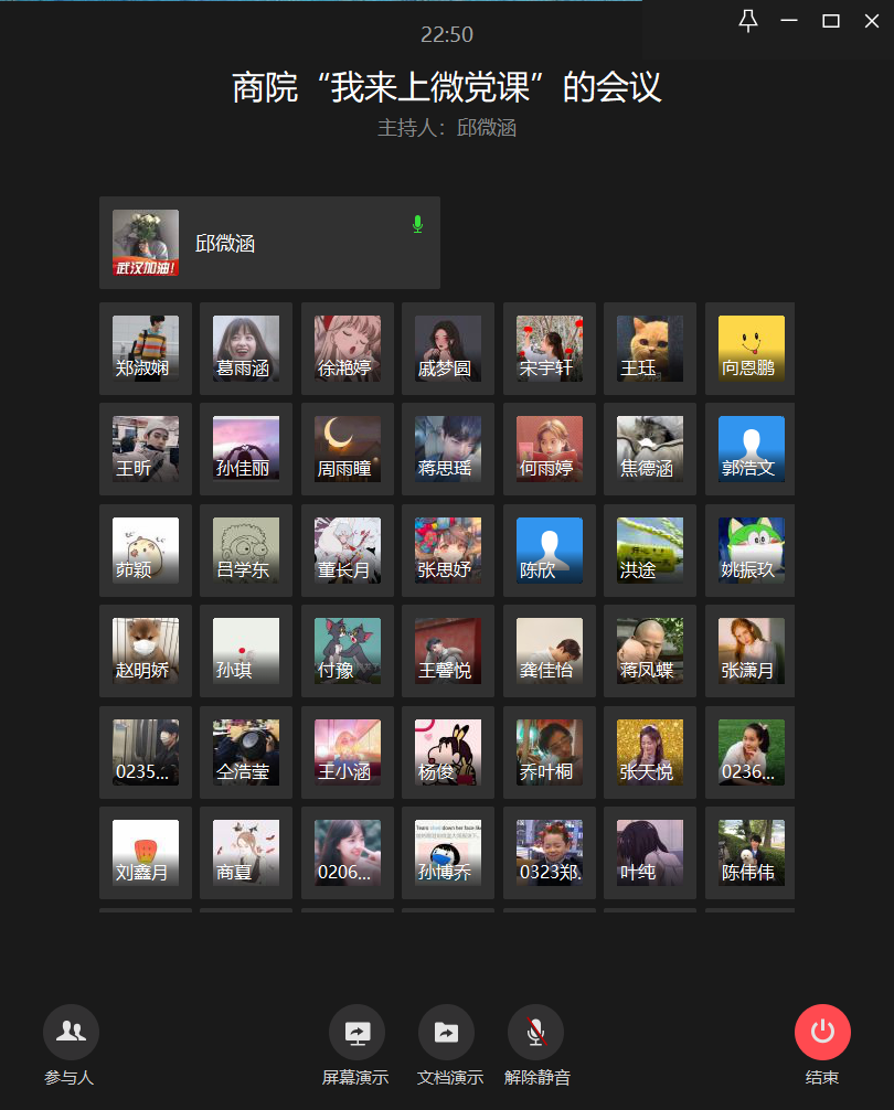 王欣冉、张天悦、商夏分别以“疫情之下,我们的前路”、“不忘初心、牢记使命,与梦同行”和“‘疫’场毕业季”为题展开微党课。三位学生党员对全球新冠疫情肆虐背景下毕业生考研深造、出国留学与就业的严峻形势进行了深度解读,结合自身的毕业方向分享了她们眼中的“责任与坚守”、“使命与担当”。