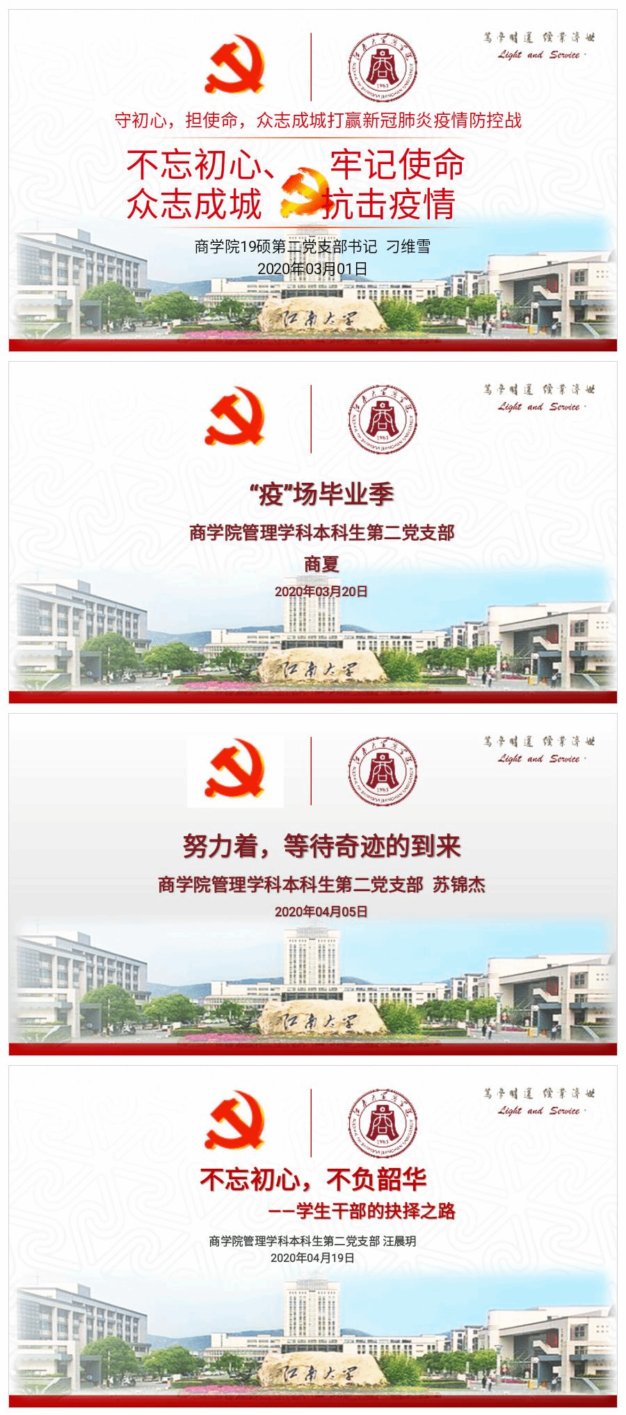 疫情防控关键时期,为提升党员党性修养,于学业敢为人先、于朋辈热于奉献、于未来敢于谋划,新葡萄8883国际官网策划组织优秀学生党员面向发展对象、入党积极分子举办了共计四期战“疫”专题“我来上微党课”活动,分别是:余莉攀、刁维雪、董雅《疫情期间,青年党员的责任与担当》,号召党员战“疫”勇担使命;王欣冉、张天悦、商夏《疫情之下,毕业生的前路》,揭示当前就业机遇与挑战;苏锦杰、布玉婷、韦雅丽《实习深造立担当,青春逐梦正当时》,助力提升人才培养质量;汪晨玥、李王新、魏清健《传承朋辈精神,秉持独立理念》,筑牢党员党性修养。本次战“疫”系列专题“我来讲微党课”,有利于助推发展对象及入党积极分子在学习中修己正心,以全新面貌迎接疫情后的大学求知成长路。