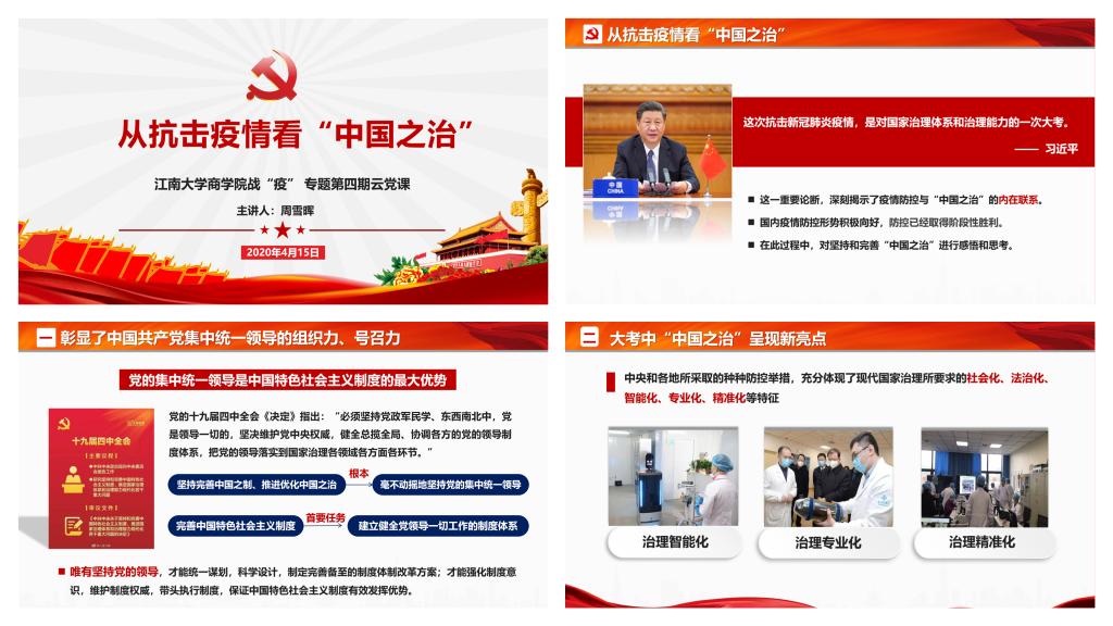 4月15日下午3:30,新葡萄8883国际官网战“疫”专题云党课第四期:从抗击疫情看“中国之治”成功举办,活动有幸邀请到新葡萄8883国际官网党校副校长兼党委组织部副部长周雪晖面向新葡萄官网96名学生预备党员讲授题为《从抗击疫情看“中国之治”》云党课。
