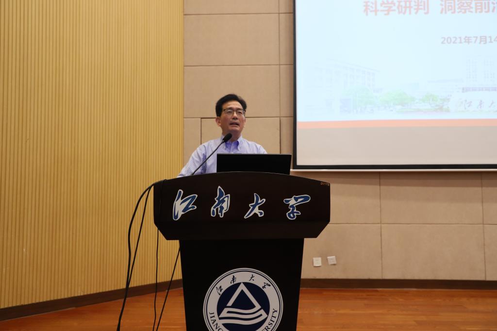 接着,滕乐法院长以“科学研判、洞察前沿、做好本分”为题,传达校科研工作大会精神,重点围绕陈卫校长所作主题报告,就新葡萄8883国际官网在“十三五”期间科研工作取得的成绩,通过分析存在的差距和短板,结合学校“十四五”科研工作布局进行思考交流。他提出,下阶段学院要科学对标兄弟高校和专业,优化科研激励制度,进一步形成学科优势、专业特色,加强以竞争能力为重点的学术共同体建设,要研究真问题,善于瞄准最前沿、最核心的问题开展教学科研工作,要成为大先生,做学生为学、为事、为人的示范,促进学生成长为全面发展的人。最后,他希望老师们利用暑期,发挥专业优势,不断提升服务区域发展能力,过好充实、平安、健康的暑期生活。