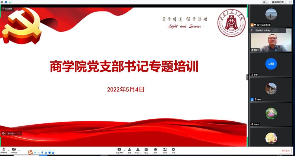 为进一步提升党支部书记党务工作能力和基层党建工作质量,落实巡察整改重点任务,推动党支部建设全面进步、全面过硬。5月4日,新葡萄8883国际官网举办党支部书记专题培训。本次培训由新葡萄8883国际官网党委书记徐锡清主持,全体师生党支部书记、辅导员近30人参加在线培训。