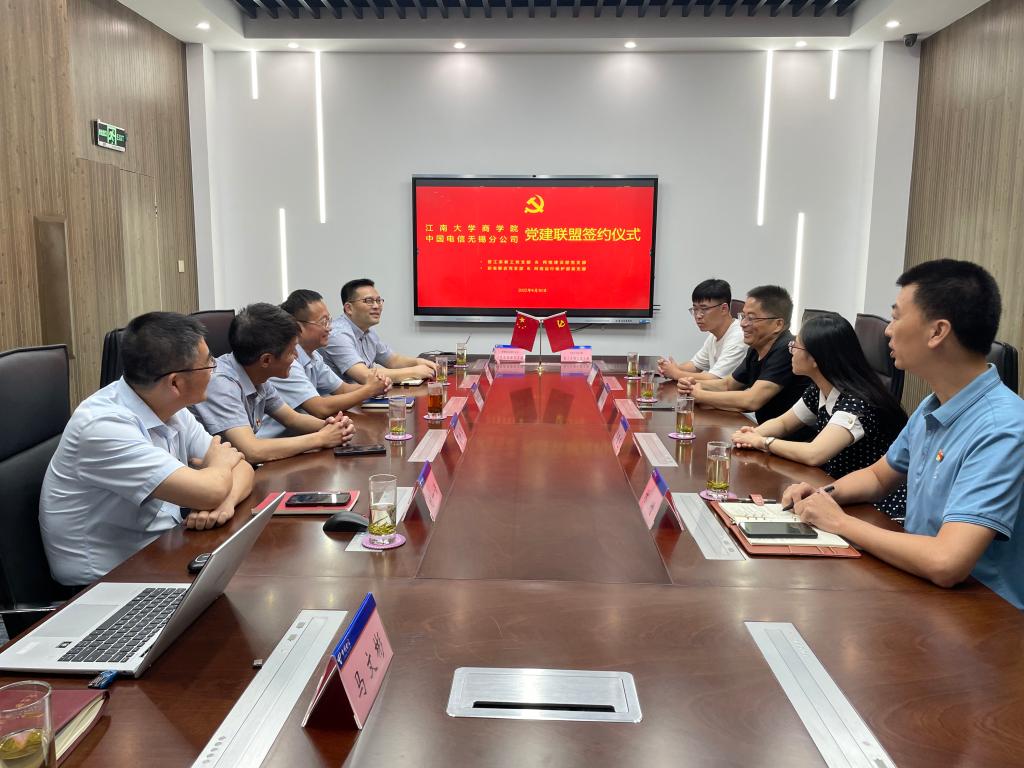 近日,新葡萄8883国际官网党委书记徐锡清、专职组织员林增、管理科学与工程教工党支部书记季春艺、新生联合党支部书记呼酩杰一行赴中国电信无锡分公司开展党建交流活动,举行党建联盟签约仪式。中国电信无锡分公司党委委员、公司副总邹易风,中国电信无锡分公司网络建设部高级督办丁新华,签约共建支部支委会成员出席活动。