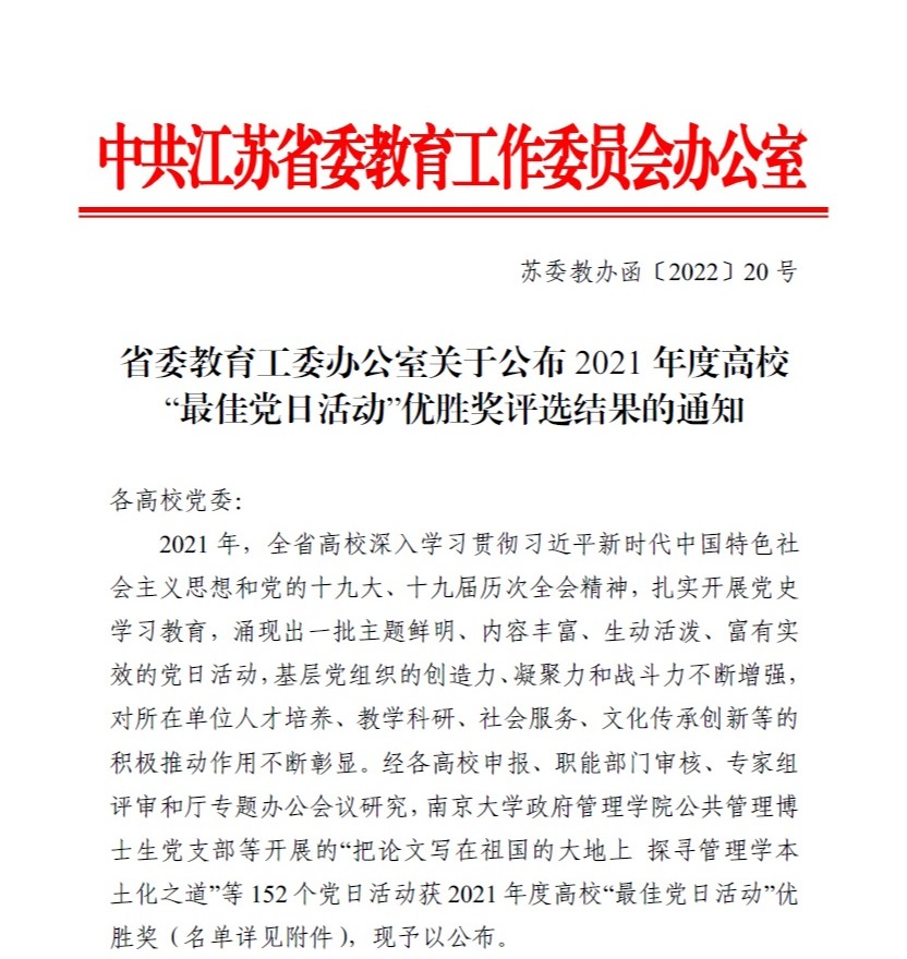日前,江苏省委教育工委办公室下发了《关于公布2021年度高校“最佳党日活动”优胜奖评选结果的通知》,新葡萄8883国际官网党委组织开展的《老少携手学党史,民族团结育新人》活动获评全省高校“最佳党日活动”优胜奖。