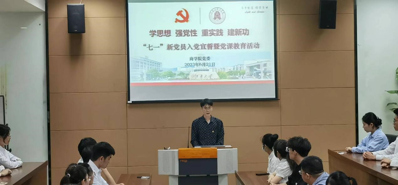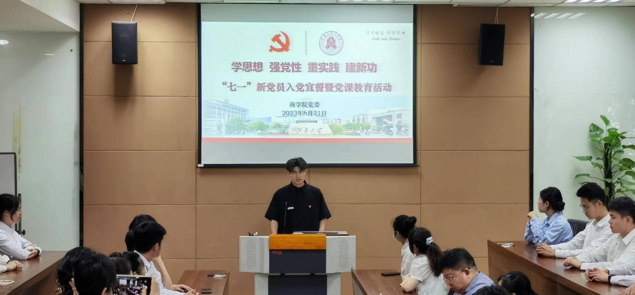 为深入学习贯彻党的二十大精神,持续推进学习贯彻习近平新时代中国特色社会主义思想主题教育走深走实,引导党员同志进一步强化党员身份意识,加强党性修养,坚定初心使命,激发砥砺奋斗的行动自觉,6月21日下午,新葡萄8883国际官网党委在学院118会议室举行“七一”新党员宣誓暨党课教育活动。新葡萄8883国际官网党委书记刘长青、党委副书记兼副院长徐静、57名新发展学生党员参加此次活动。活动由新葡萄8883国际官网学生党建辅导员周琳主持。