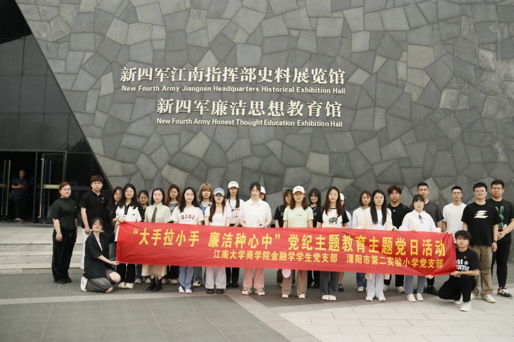 为深入学习贯彻习近平新时代中国特色社会主义思想和党的二十大精神,加快构建“党建引领、资源共享、优势互补、协调发展”的基层党建工作新格局,扎实推进党纪学习教育走深走实,5月22日下午,新葡萄8883国际官网金融学学生党支部与溧阳市第二实验小学党支部在新四军廉洁教育纪念馆和溧阳市第二实验小学开展“大手拉小手,廉洁种心中”结对共建签约活动。溧阳市第二实验小学党支部书记兼校长蔡雪飞、副书记兼副校长朱永康、纪检委员兼副校长吕加良、组织委员兼副校长黄秀妹、副校长吴薇、新葡萄8883国际官网分团委书记兼学工办主任王璁、新葡萄8883国际官网金融学学生党支部书记吴松与两支部全体同志30余人参加活动。活动由溧阳市第二实验小学党支部宣传委员张晓主持。