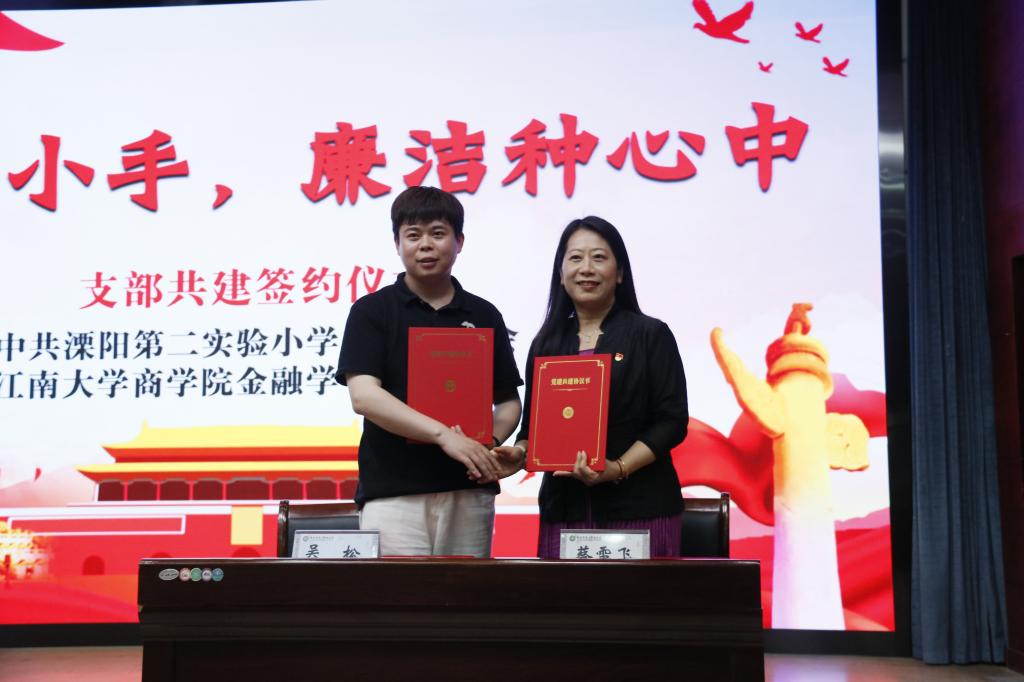 之后,在双方党员的见证下,中共溧阳市第二实验小学支部委员会与中共新葡萄8883国际官网金融学学生支部委员会开展“大手拉小手,廉洁种心中”的党建联盟签约共建仪式。