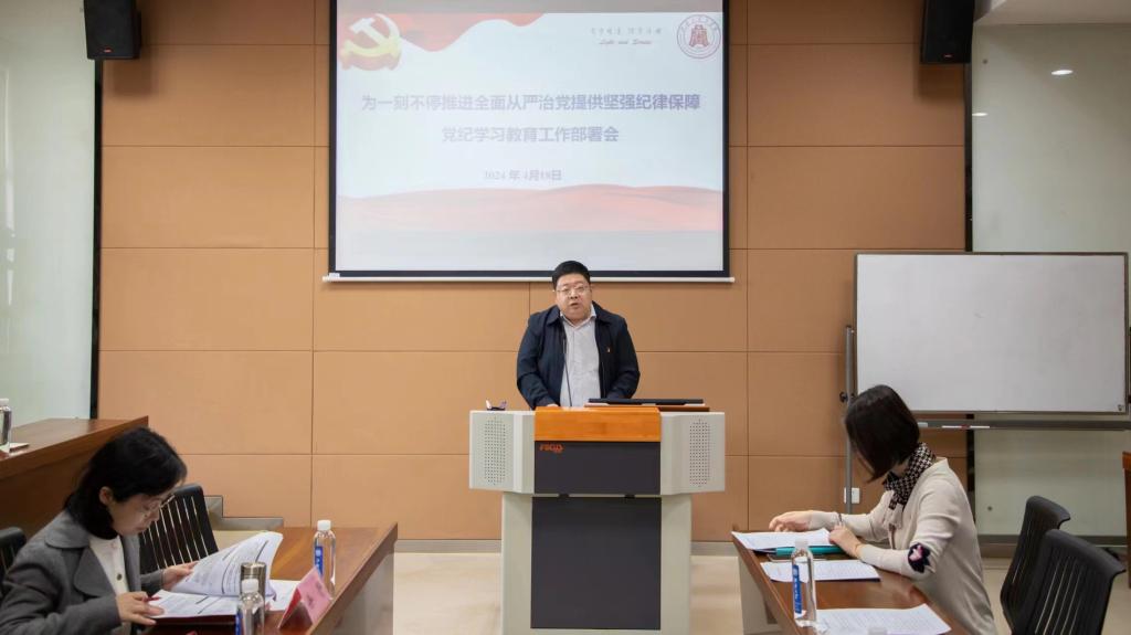 刘长青传达了中共中央关于在全党开展党纪学习教育的精神以及学校党纪学习教育工作部署会要求。他强调,一要提高站位,学深悟透精神。深入学习领悟习近平总书记关于党纪学习教育重要讲话和重要指示精神,提高政治站位,深刻把握党纪学习教育的政治指向、目标任务、实践要求;二要明确重点,不折不扣落实。各支部和广大党员要不折不扣抓好贯彻落实,走深走实推动各项措施落地见效。要原原本本学纪,围绕《中国共产党纪律处分条例》认真学、逐条学,融入日常、抓在经常,同时扎实开展个人自学、集中学习、文化涵育、警示教育、专题培训、宣传解读等工作;三要学以致用,确保取得实效。要联系实际知纪,结合本人实际、工作实际,自觉对照《中国共产党纪律处分条例》各项规定,用党规党纪校正思想和行动,真正使学习党纪过程成为增强纪律意识、提高党性修养的过程。