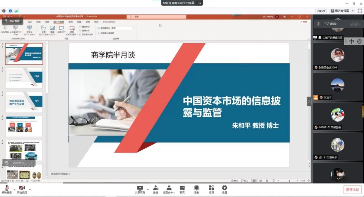 4月22日下午,新葡萄8883国际官网第155期“半月坛”系列讲座通过腾讯会议平台在线举行。新葡萄8883国际官网会计学专业教授朱和平作为主讲嘉宾,为新葡萄官网150余名本科生做了题为“中国资本市场的信息披露与监管”的专题讲座。