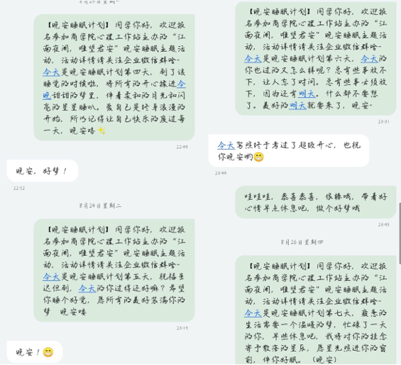 为积极营造心理健康文化氛围,引导学生养成科学作息和健康心态,8月20日-9月2日,新葡萄8883国际官网心理工作站策划举办了“江南夜阑,唯望君安”之【云“商”守护】晚安睡眠计划活动,帮助学生改善睡眠,化解不良情绪,引导他们在疫情下以积极饱满的精气神迎接即将到来的新学期。
