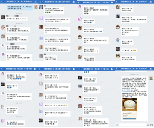 晚安睡眠计划由三个环节组成:发布每日睡前讨论话题,督促坚持早睡打卡,短信传递晚安祝福。招募的心理委员所担任的“晚安信使”就是祝福的传递者,他们发挥着整个活动的桥梁纽带作用,传递了朋辈互助的温情力量。工业2001心理委员任涛认为“担任信使,传递温暖与祝福是一件很有爱有温度的事情”;工商1902心理委员何若瑶表示“陌生人的晚安祝福,不仅温暖了手机那端接收短信的同学,也温暖了自己”。