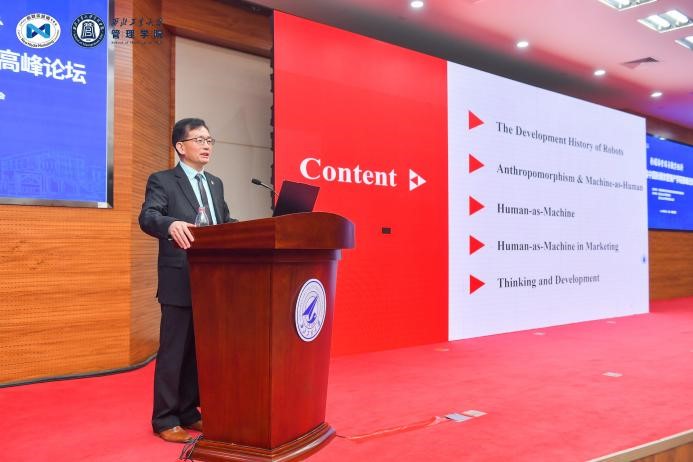 会上,滕乐法教授发表了关于《The effects and mechanism of human-as-machine representation in marketing on consumer behavior》的主旨报告。报告梳理了机器人的发展历程,将其汇总为四个发展阶段,指出目前机器拟人化的研究已变得较为成熟,而人拟机器化的研究尚需深入。报告基于CAB模型,在营销领域应用人拟机器化进行了详细讨论,构建了全新的理论框架,扩展了现有的人拟机器化理论。该主题报告指出虚拟化身、VR、脑机接口(BCI)等设备是目前实现人拟机器化的前沿应用,同时强调人与机器之间的界限正在逐渐模糊,人拟机器化和人机交互将在未来展现广阔的发展和研究空间。