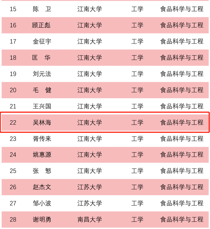 科学私享根据网站公布的《食品科学与工程》一级学科的2023中国高贡献学者名单绘制下图,从图中可以看出,《食品科学与工程》一级学科共计46人入选榜单,其中新葡萄8883国际官网上榜11人,占23.9%;其中,江苏省重点培育智库、新葡萄8883国际官网食品安全风险治理研究院首席专家兼院长、新葡萄8883国际官网吴林海教授入选食品科学与工程上榜学者名单。
