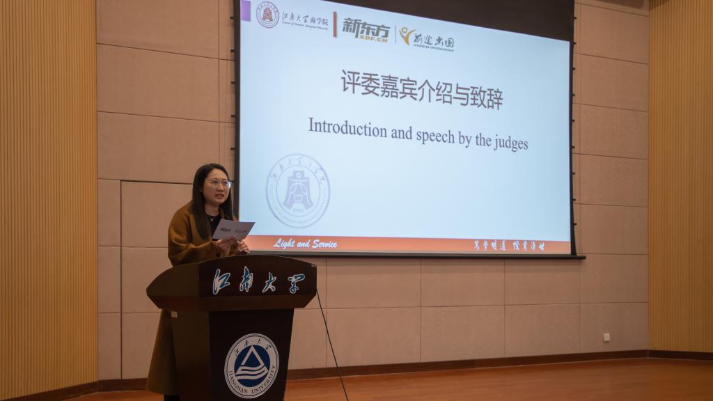 活动伊始,新东方前途出国无锡分公司美国部负责人任爽致开场辞。她指出,举办此次英语配音大赛旨在提升大学生对配音艺术的热爱以及英语学习的兴趣,她希望通过比赛以赛促学,提高学生英语表达能力与感情演绎能力,更好地理解经典影视作品所传递的思想与内涵。最后她鼓励学生继续保持对英语配音的热爱,在此次大赛中取得佳绩,为大学生活增添一份美好回忆。