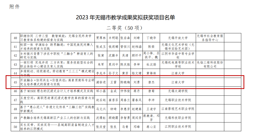 新学期伊始,无锡市教育局公示了2023年无锡市教学成果奖获奖名单。新葡萄官网申报的“开放融合·协同共生·价值共创:高素质商科专业研究生培养模式的探索与实践”获得无锡市教学成果二等奖。