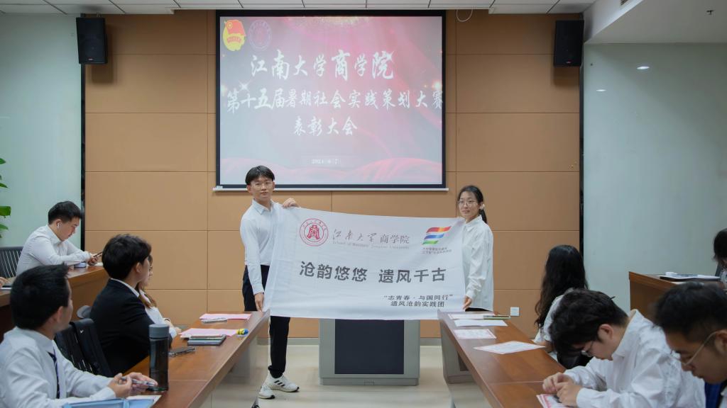 “曲水流‘商’”实践团董平川为“遗风沧韵”团队授旗