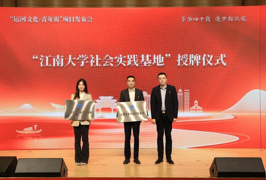 魏珍吉向无锡市城市投资发展有限公司、无锡广播电视集团(台)融媒体中心两家单位进行“新葡萄8883国际官网社会实践基地”授牌,并向“运河文化·青年说”宣讲团授旗。