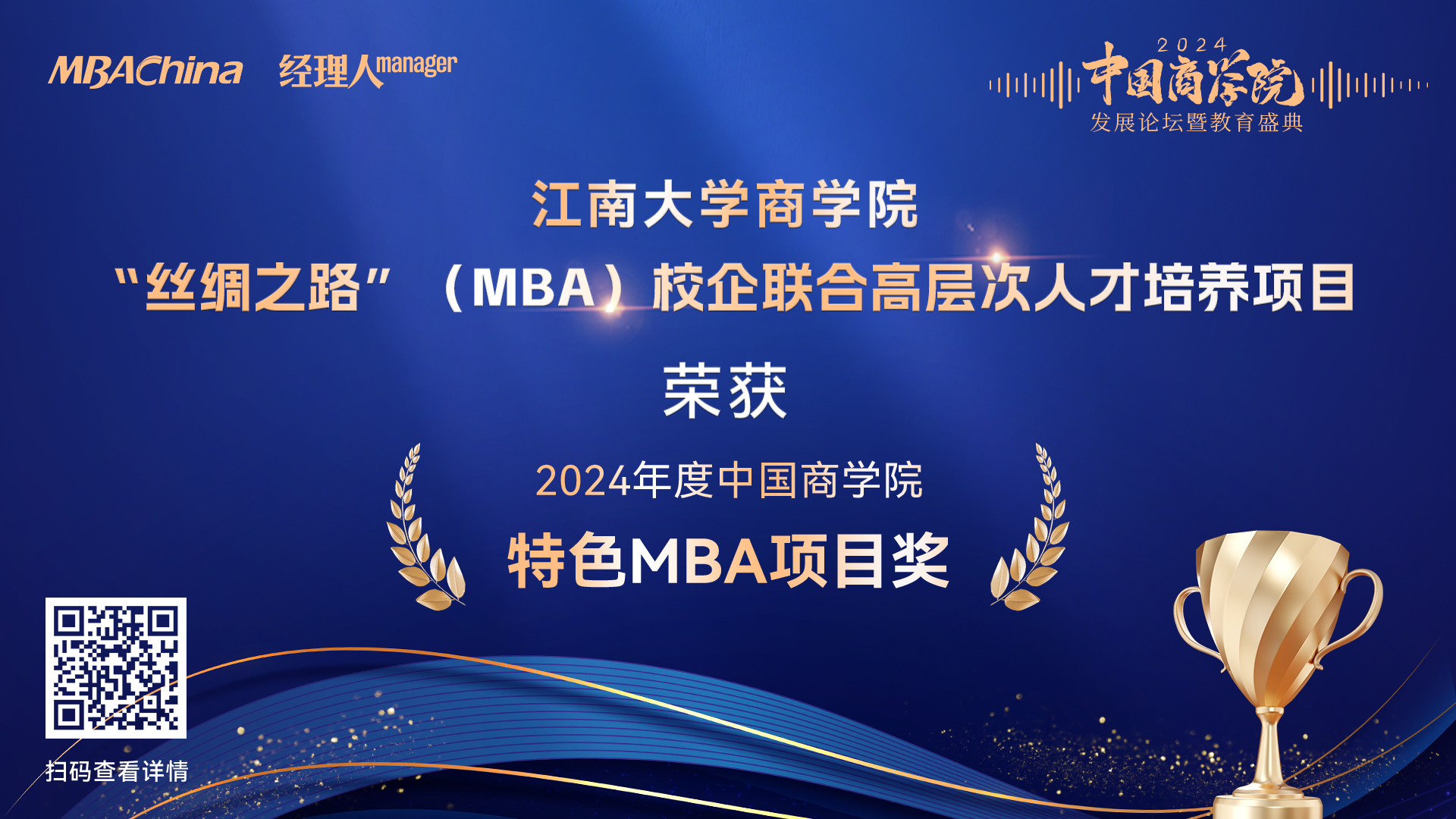 新葡萄8883国际官网,历经16年MBA办学过程,入榜《2024年度中国新葡萄8883国际官网MBA项目TOP100榜单》(排名48位,较2023年排名上升2位);“丝绸之路”工商管理校企联合高层次人才培养项目继去年之后再度荣获“2024年度中国新葡萄8883国际官网特色MBA项目奖”;王雷副院长荣获“2024年度中国新葡萄8883国际官网卓越运营奖”。