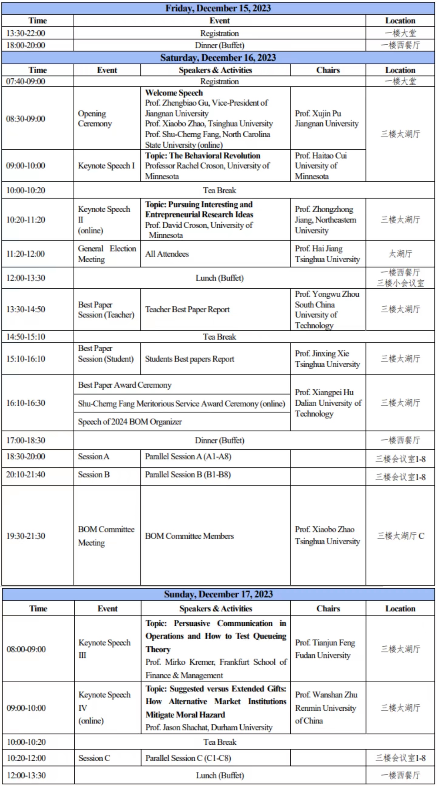 行为运筹学与行为运营管理研讨会在过去十四年间相继在清华大学(2009、2010、2011)、西南财经大学(2012)、大连理工大学(2013)、上海理工大学(2014)、天津大学(2015)、东南大学(2016)、东北大学(2017)、华南理工大学(2018)、北京外国语大学(2019)、南京大学(2020)、香港中文大学(深圳)(2021)、桂林电子科技大学(2022)成功举办,历年学术报告都涌现出众多优秀和有创意的研究,拓展了参会学者的视野,已经成为一个有重要影响的学术交流平台。