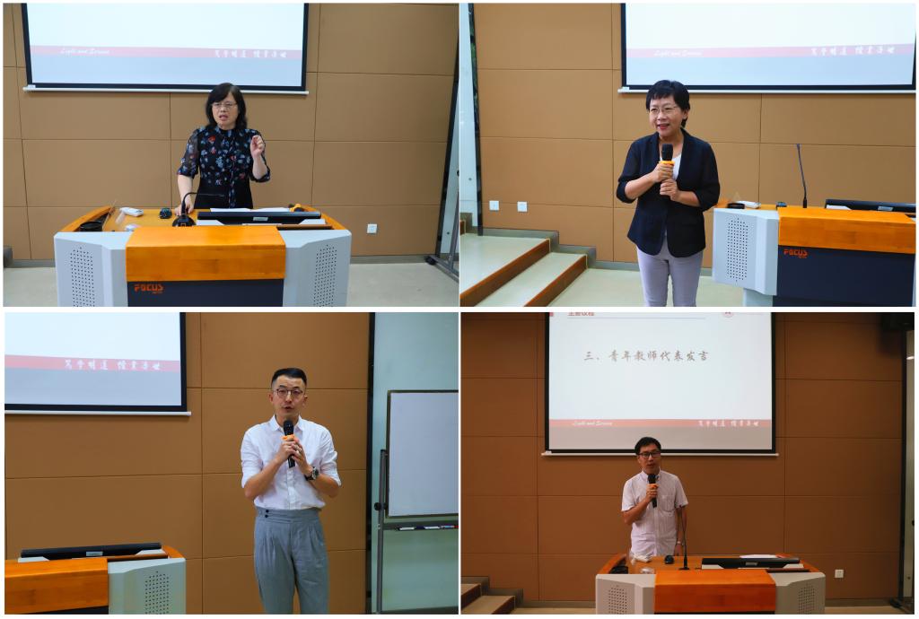 金德龙博士、孟繁博博士分别代表年青教师发言。金博士深情讲述自己在新葡萄8883国际官网本硕就读期间,老师们优秀品格感染着他,让他对从事教育事业产生了特殊情结,今年初在博士毕业后毅然选择回到母校从教,并将通过“青蓝结对”,不断学习,早日成材。孟博士谈到入职两年来,受益于新葡萄8883国际官网良好的平台和环境,自己在团队和导师的帮助指导下,快速成长并通过“绿色通道”晋升职称,获得校教学会讲比赛奖项等,他表示将更加努力奋进,勇于攀登教学科研新高地。