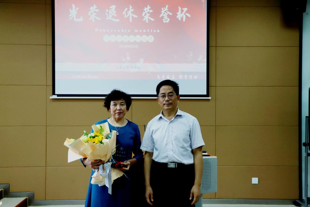 退休教师荣休仪式上,首先诵读院党委对光荣退休的曹炳汝、王燕茹老师送出的感谢辞,徐锡清书记给两位老师颁授“光荣退休荣誉杯”,学生代表献上鲜花感念师恩。