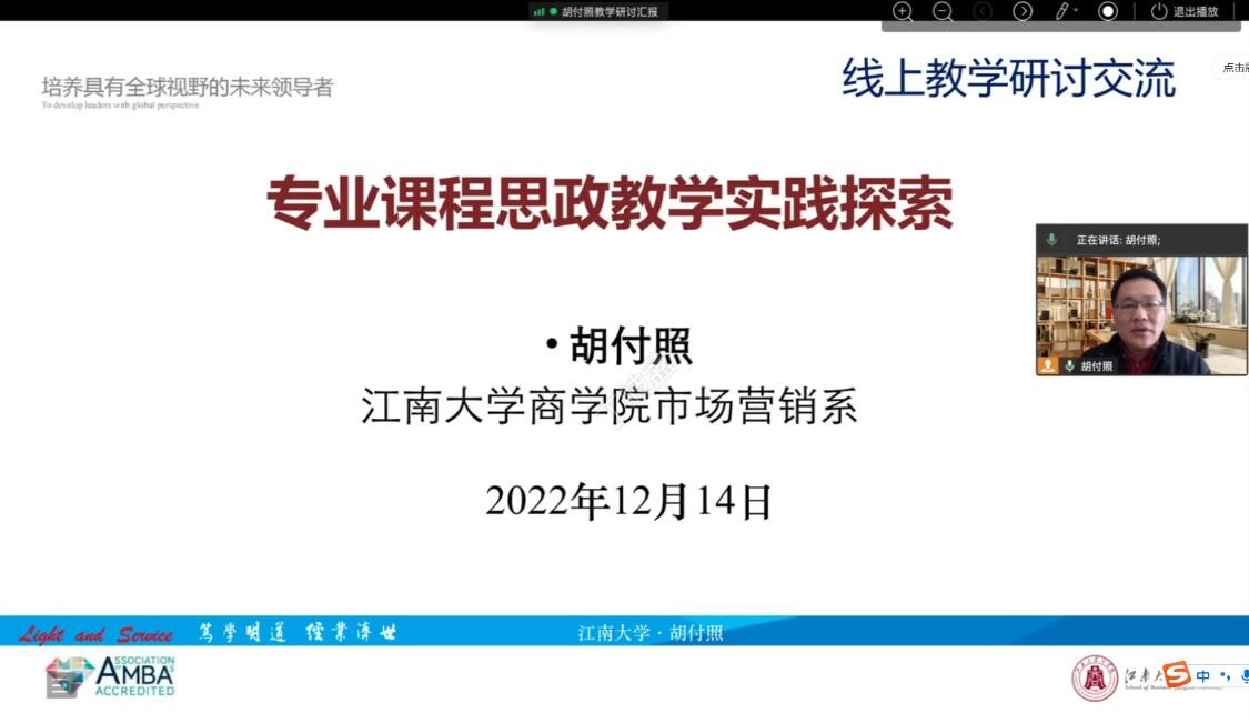 胡付照围绕“MBA与本科生课程的融合创新的教学模式探索”“通识教育课程的从微到课的专业化可持续建设”等内容展开讲述。自2017年接受MBA《企业伦理与社会责任》课程、本科生《企业伦理与会计职业道德》《商业伦理》课程以来,胡老师在教学方面进行了多方面的探索,在课堂理论与案例教学方面积累了一定的经验。在科研、教学、社会服务、民主党派参政议政等方面,做到有机融合,巧妙化成教学资源,紧紧围绕专业育人中心,不断探索教学方法,为学生综合素质的提升,用心而为。在融合创新的教学模式的探索方面,他以“新时代商业创新人才培养课程实践的产学融合、知行融合”为双核心,融合创新创业比赛、企业家进课堂、案例分析训练、MBA作业成果分享等多种形式,不断提升课程专业思政内涵,受到了学生的好评,近两年来获得了两封校教学评估与教师卓越中心的感谢信,从校内到校外,他主持开发的茶与紫砂文化专题的公益课程,在中国大学MOOC、超星学习通等平台上线,深受社会人士和学生的好评。