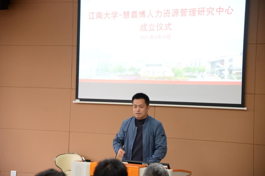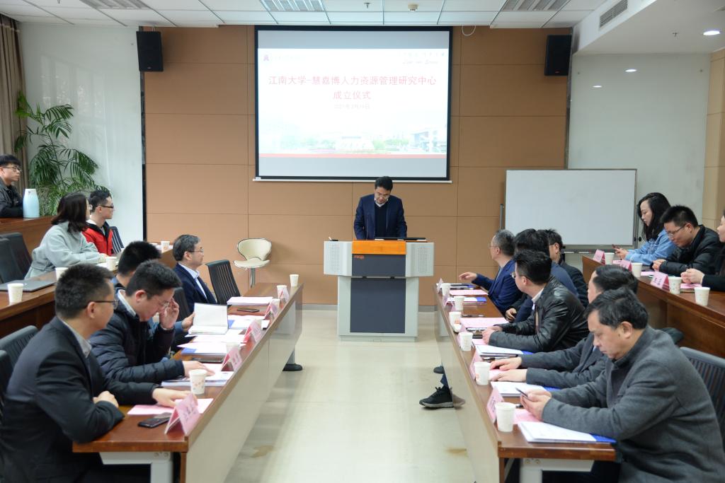 蒋丹董事长介绍了隶属于江苏慧嘉博人力资源集团的江苏开心工作科技有限公司情况,该公司以线上技术与线下服务相融合为发展方向,致力于为客户提供高质量人力资源综合解决方案。“新葡萄8883国际官网-慧嘉博人力资源管理研究中心”的成立,将为深化双方合作研究、服务区域人力资源开发贡献力量,今后双方要开展深度合作,共同提升研究中心的社会服务与决策咨询能力。朱晋伟教授介绍了无锡市人力资源开发研究基地发展情况,以及取得的研究成果,同时还对“新葡萄8883国际官网-慧嘉博人力资源管理研究中心”未来发展方向、重点工作做了详细介绍。