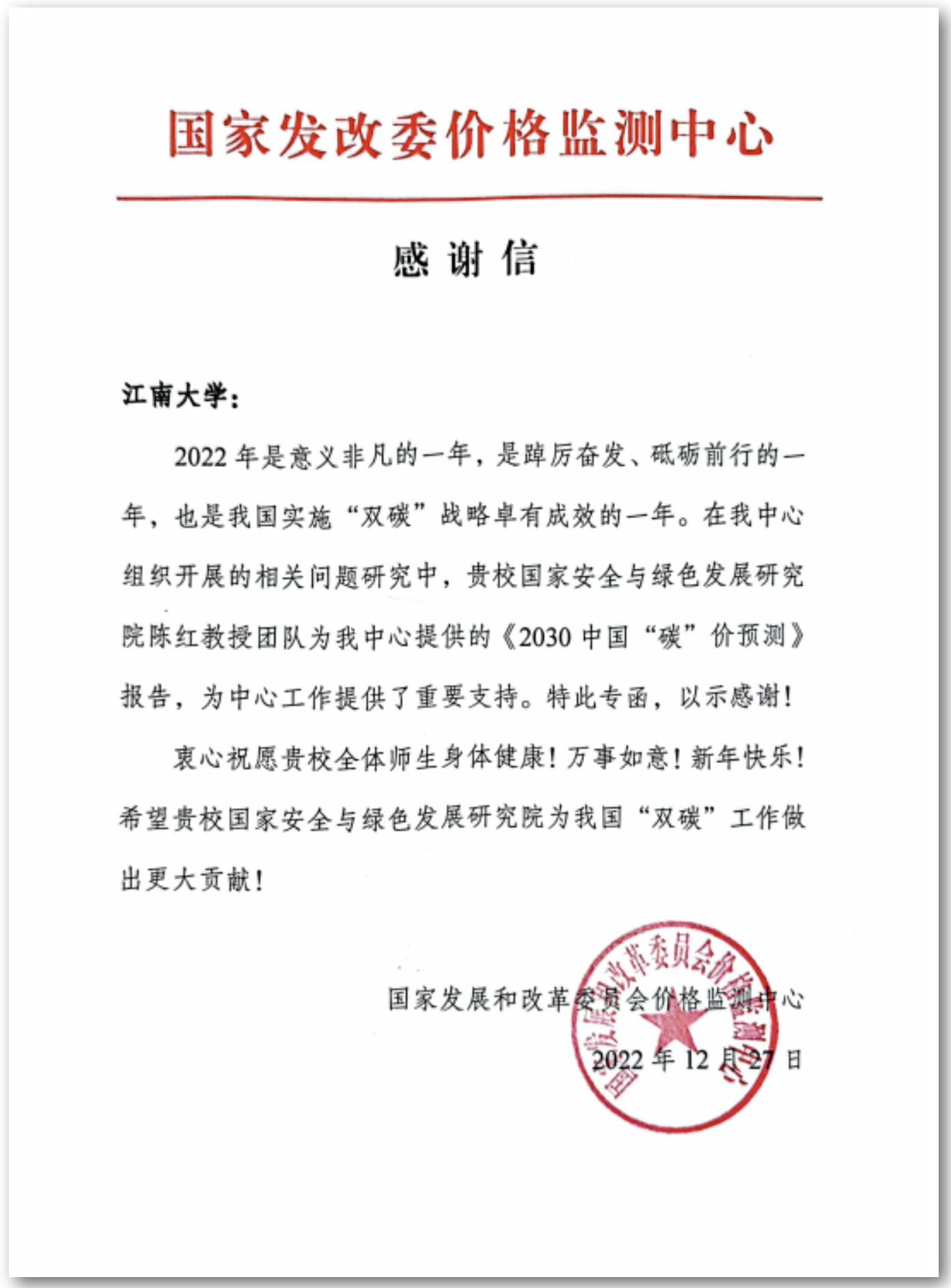 2022年6月17日,新葡萄8883国际官网国家安全与绿色发展研究院接到国家发改委价格监测中心商请协助做好碳交易价格研究支持的函,研究院随即组织专班开展专项研究,并于2022年8月6日将《2030中国“碳”价预测》报告提交给国家发改委价格监测中心。2022年12月27日,国家发改委价格监测中心给新葡萄8883国际官网致专函感谢新葡萄8883国际官网国家安全与绿色发展研究院团队《2030中国“碳”价预测》报告为中心工作提供的重要支持。