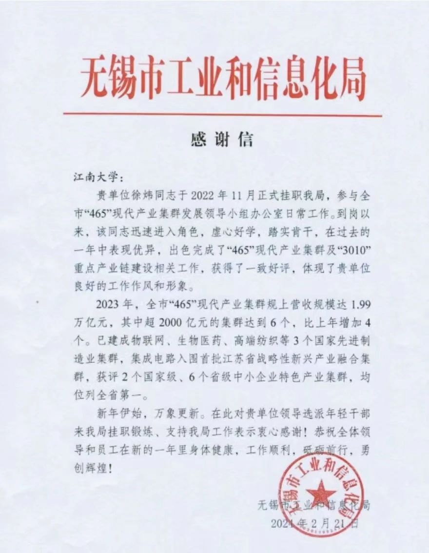 新葡萄官网金融系系主任徐炜副教授于2022年11月挂职无锡市工业和信息化局,参与无锡市“465”现代产业集群发展领导小组办公室日常工作。徐炜副教授到岗后迅速融入角色,虚心学习,踏实肯干,在过去的一年中表现优异,出色完成了“465”现代产业集群及“3010”重点产业链建设相关工作,获得了一致好评。体现了新葡萄8883国际官网良好的工作作风和形象。