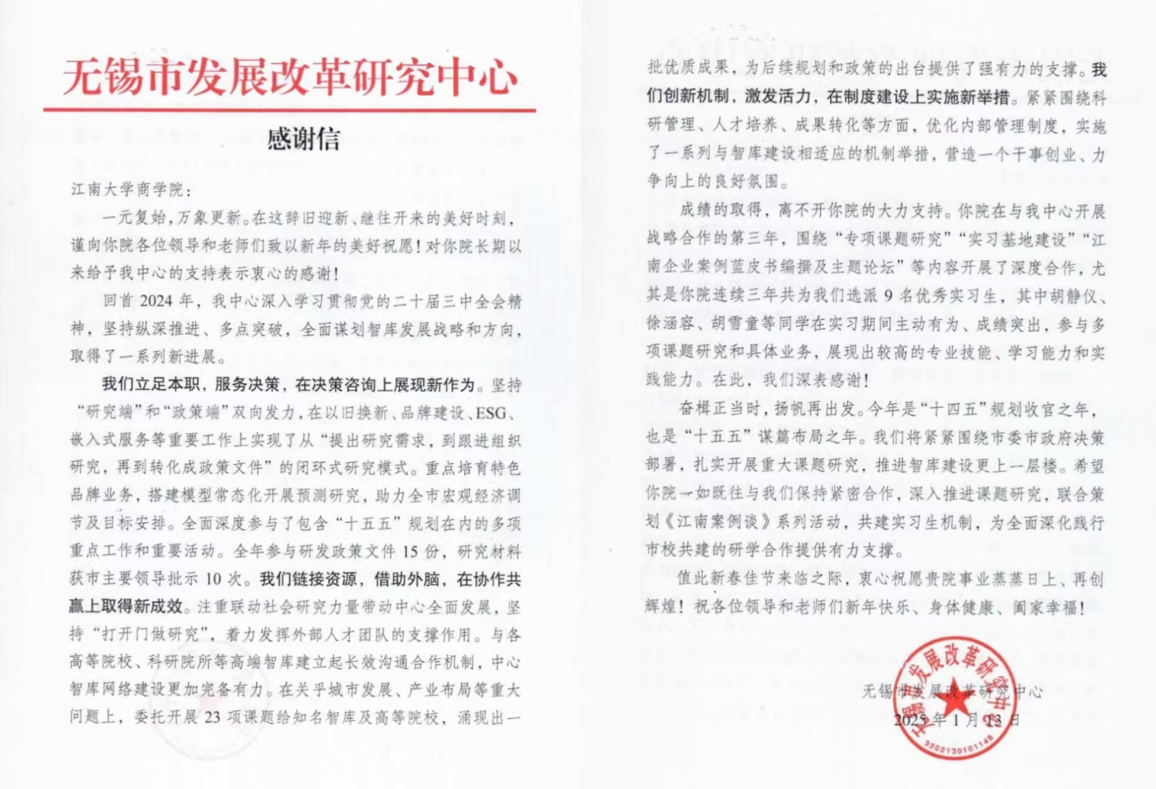 1月13日,无锡市发展改革研究中心特向新葡萄官网发来感谢信,对学院为服务地方经济高质量发展提供的智力支持和人才支撑,予以高度肯定和衷心感谢,并向新葡萄官网全体教职工致以新春祝福。
