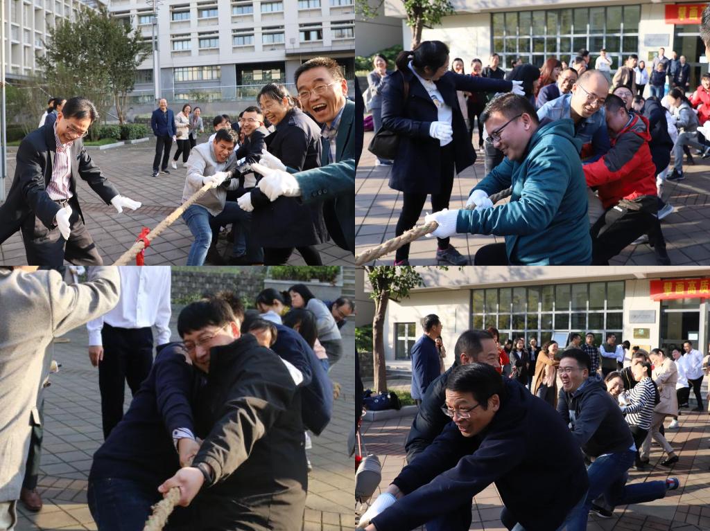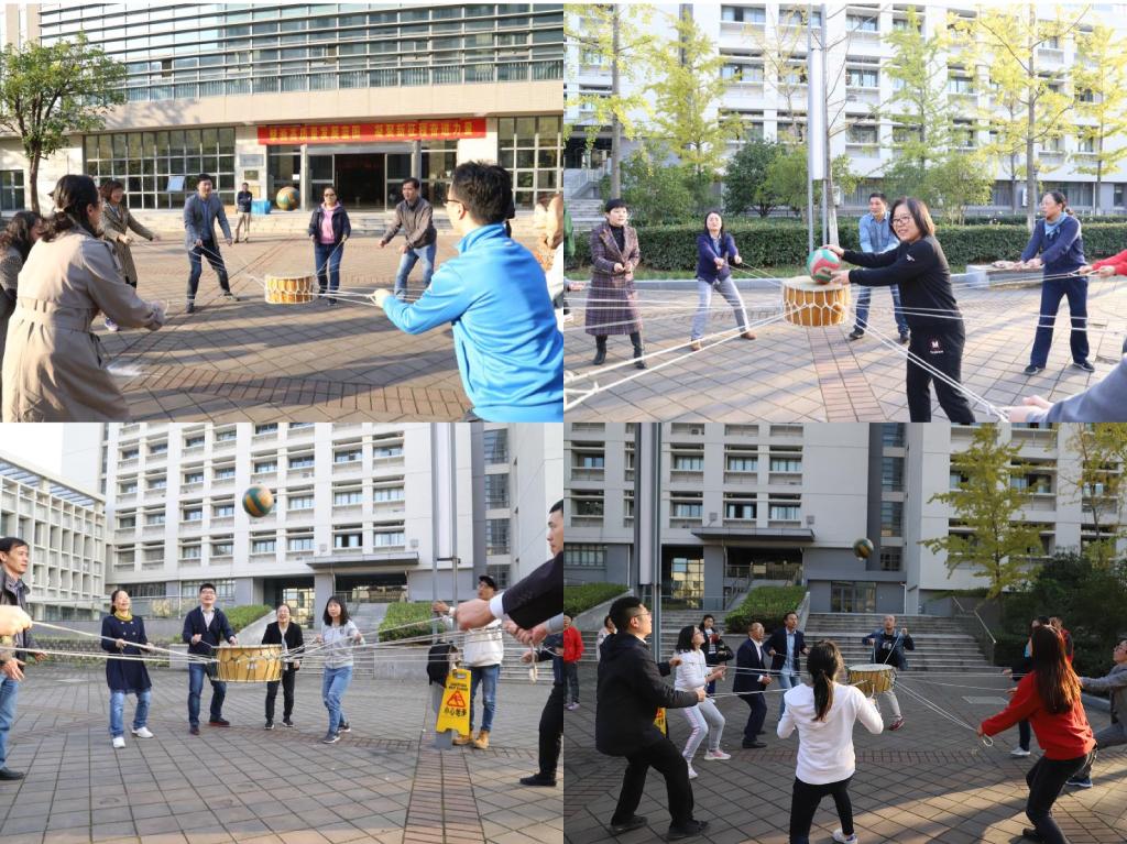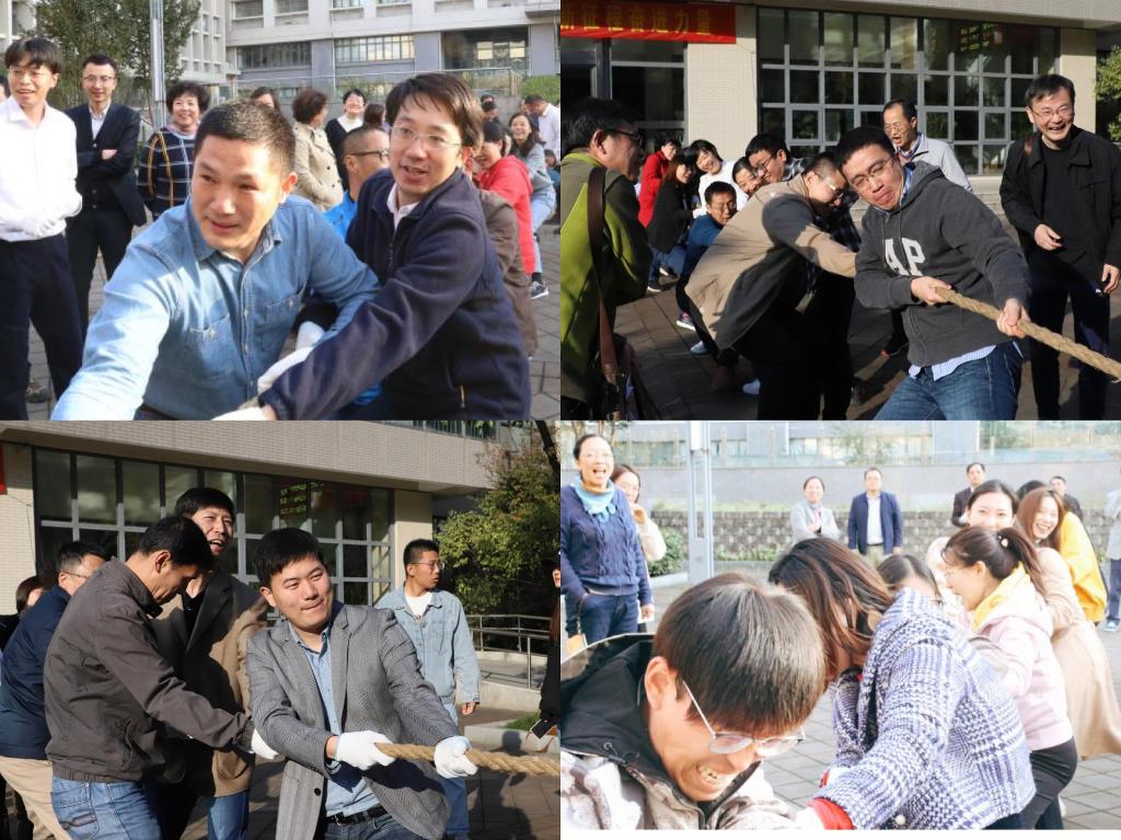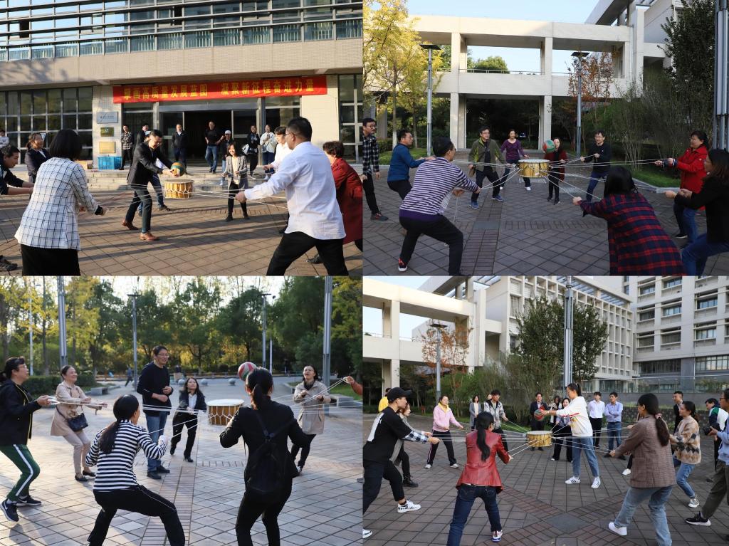 合影后,在学院南门广场举办教职工体育活动,由各系及行政部门分别组成的8支队伍,举办了拔河、同心鼓比赛活动。此次活动,由各系部的分工会小组长精心组织落实拔河队伍,由五男五女共十名教师组队;同心鼓队伍,由四男四女共八名教师组队。总裁判由学院林增老师担当,经过各系部小组长的抽签,拔河一轮比赛淘汰一支队伍,紧张而激烈的角逐,赛场上,口号声、欢笑声响成一片。同心鼓比赛,以三分钟内以鼓颠球的总次数多者取胜。