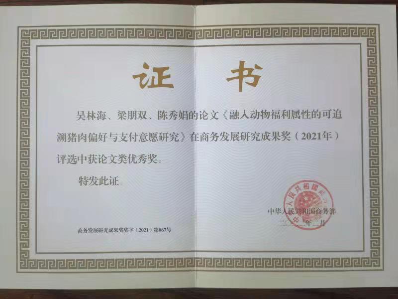近日,新葡萄官网在商务发展研究成果奖项方面传来佳讯。浦徐进教授的专著《供应链模式创新:线上线下融合之路》获得国家商务部商务发展研究成果奖(2021)论著类二等奖;吴林海教授的论文“融入动物福利属性的可追溯猪肉偏好与支付意愿研究”获论文类优秀奖