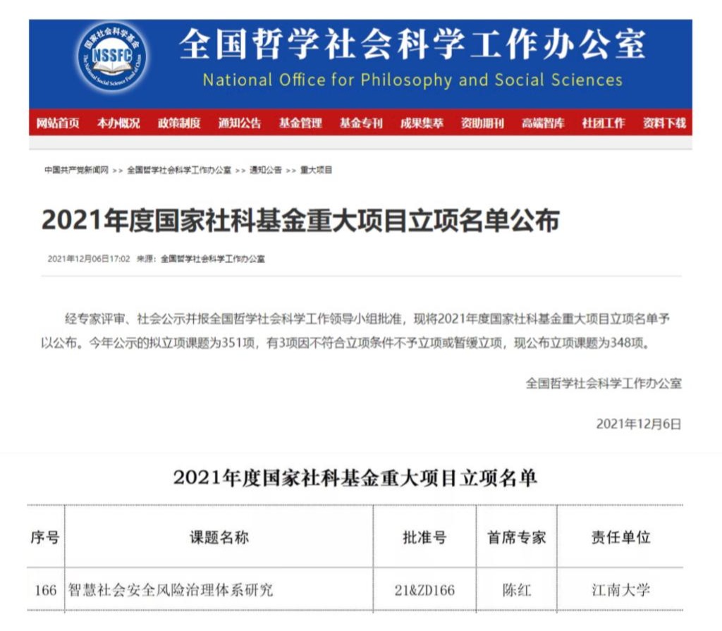 2021年12月6日,全国哲学社会科学工作办公室正式公布了2021年度国家社会科学基金重大项目立项名单,新葡萄8883国际官网国家安全与绿色发展研究院院长陈红教授作为首席专家申报的“智慧社会安全风险治理体系研究”获得立项,项目批准号(21&ZD166)。这是陈红教授主持的第2个国家社会科学基金重大项目。