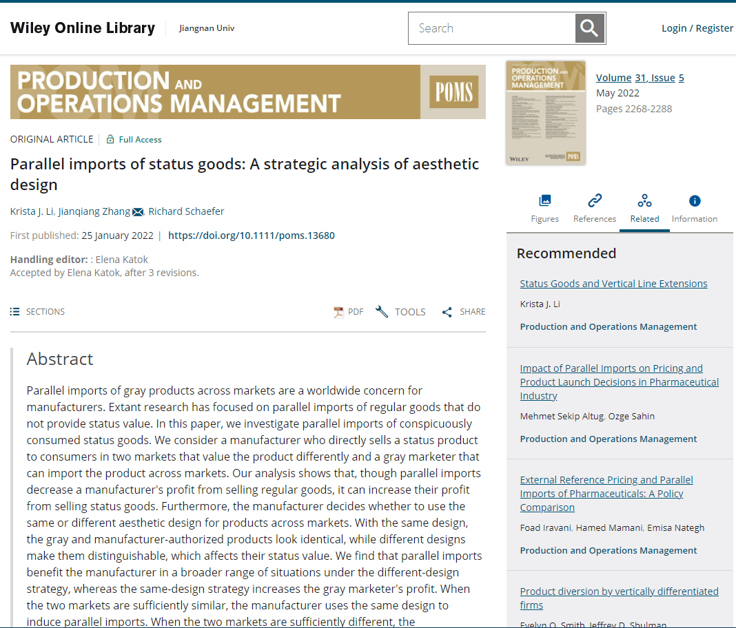 近日,新葡萄官网张建强教授与美国印第安纳大学的Krista J. Li副教授和美国罗格斯大学的Richard Schaefer助理教授合作的论文“Parallel imports of status goods: A strategic analysis of aesthetic design”在管理学领域顶级期刊《Production and Operations Management》(简称POM)正式刊出。POM是美国德克萨斯大学达拉斯分校(University of Texas at Dallas)评定的新葡萄8883国际官网最顶尖的24本学术期刊(UTD 24)之一,也是金融时报评定的50本新葡萄8883国际官网顶级期刊(FT 50)之一,在国际管理学界享有极高的学术声誉。张建强教授为本研究的通讯作者和共同第一作者。