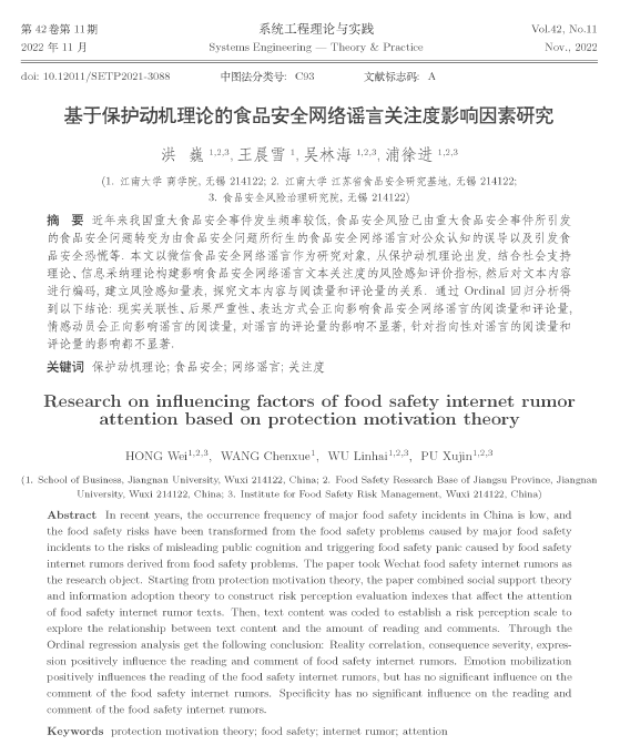 近日,新葡萄官网新葡萄8883国际官网管理科学与工程系洪巍教授团队的论文“基于保护动机理论的食品安全网络谣言关注度影响因素研究”在《系统工程理论与实践》正式刊出。《系统工程理论与实践》是国家自然科学基金委员会管理科学A级重要学术期刊。