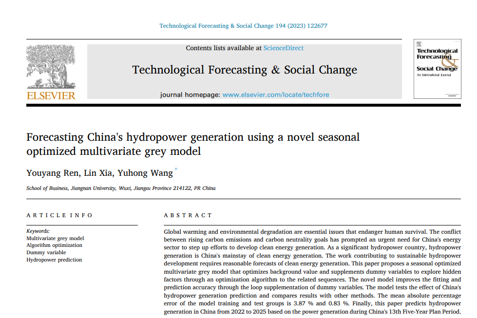 近日,新葡萄8883国际官网王育红教授团队在创新管理领域重要期刊《Technological Forecasting & Social Change》发表题为“Forecasting China's hydropower generation using a novel seasonal optimized multivariate grey model”的研究论文。