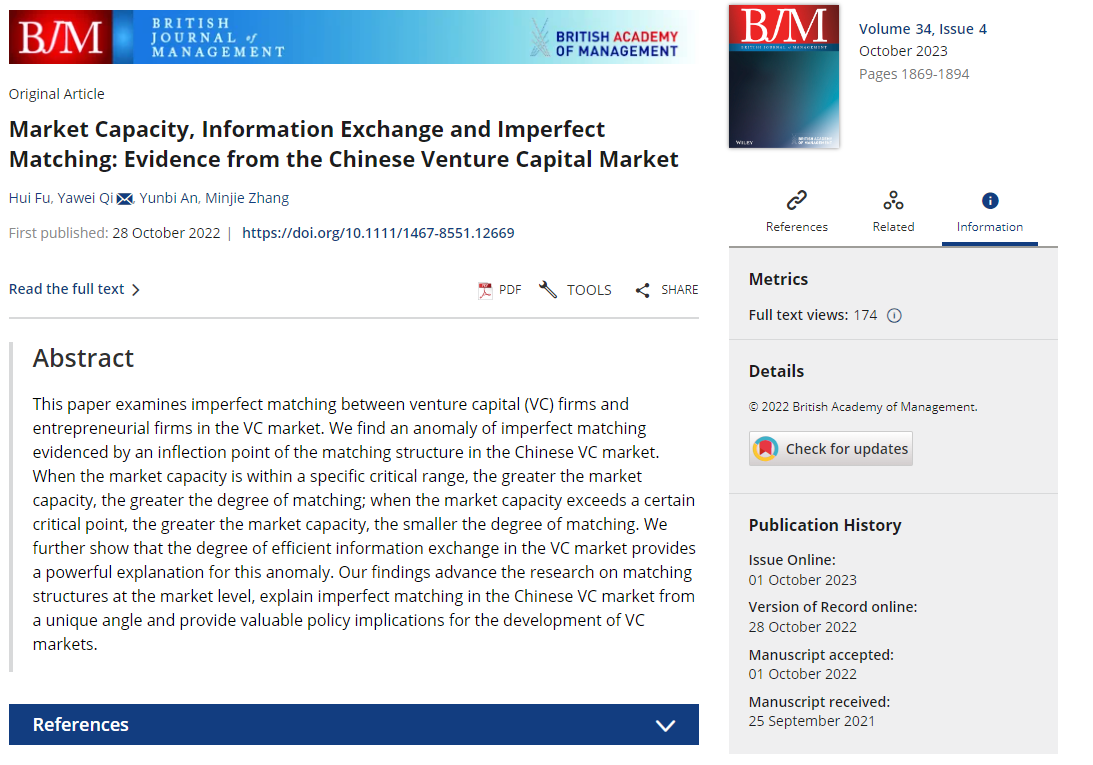 近日,国际权威期刊《British Journal of Management》正式刊发了新葡萄官网付辉副教授作为第一作者与合作者共同完成的论文“Market Capacity, Information Exchange and Imperfect Matching: Evidence from the Chinese Venture Capital Market”(市场容量、信息交换与不完美匹配:来自中国风险投资市场的证据)。