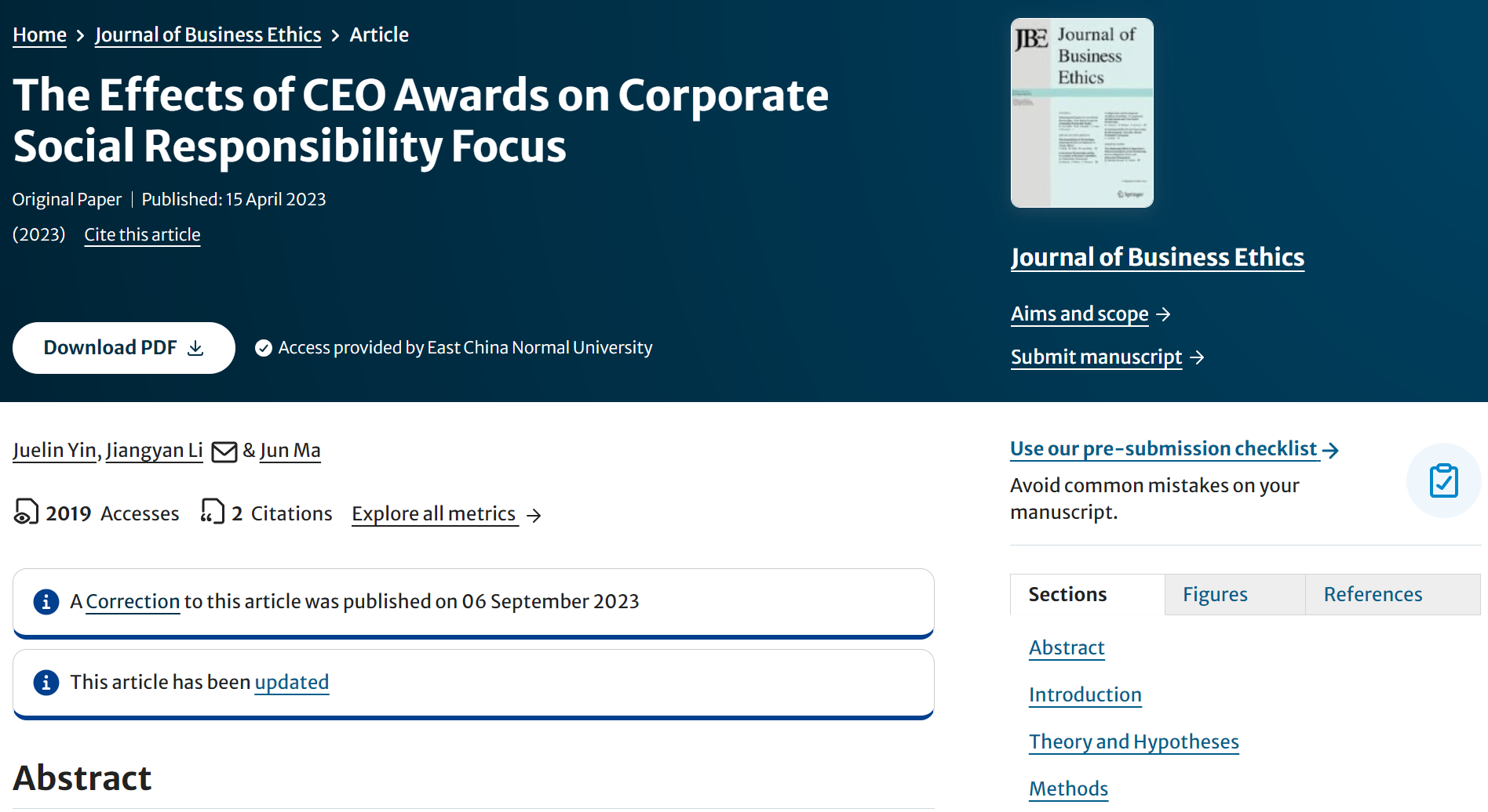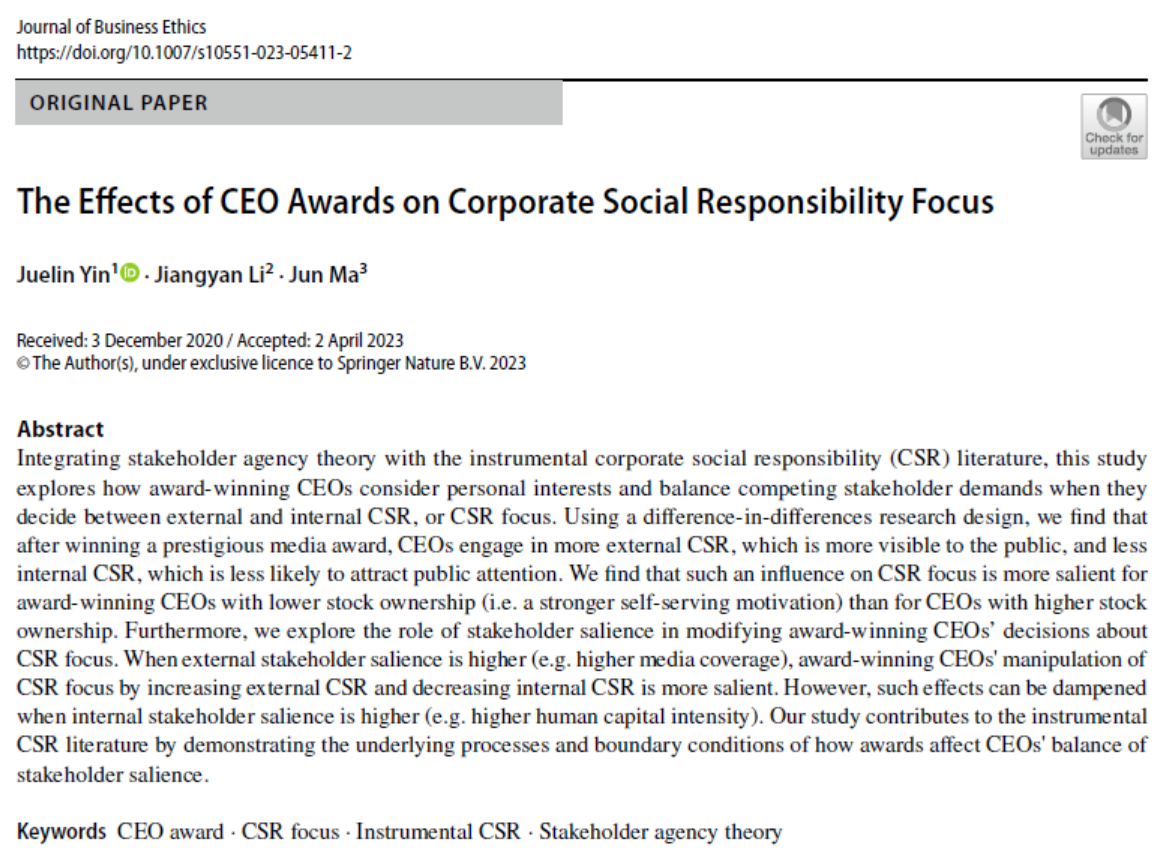 近日,国际权威期刊《Journal of Business Ethics》在线发表了新葡萄官网马骏副教授与合作者共同完成的论文“The Effects of CEO Awards on Corporate Social Responsibility Focus”(CEO获奖对企业社会责任关注重点的影响效应)。