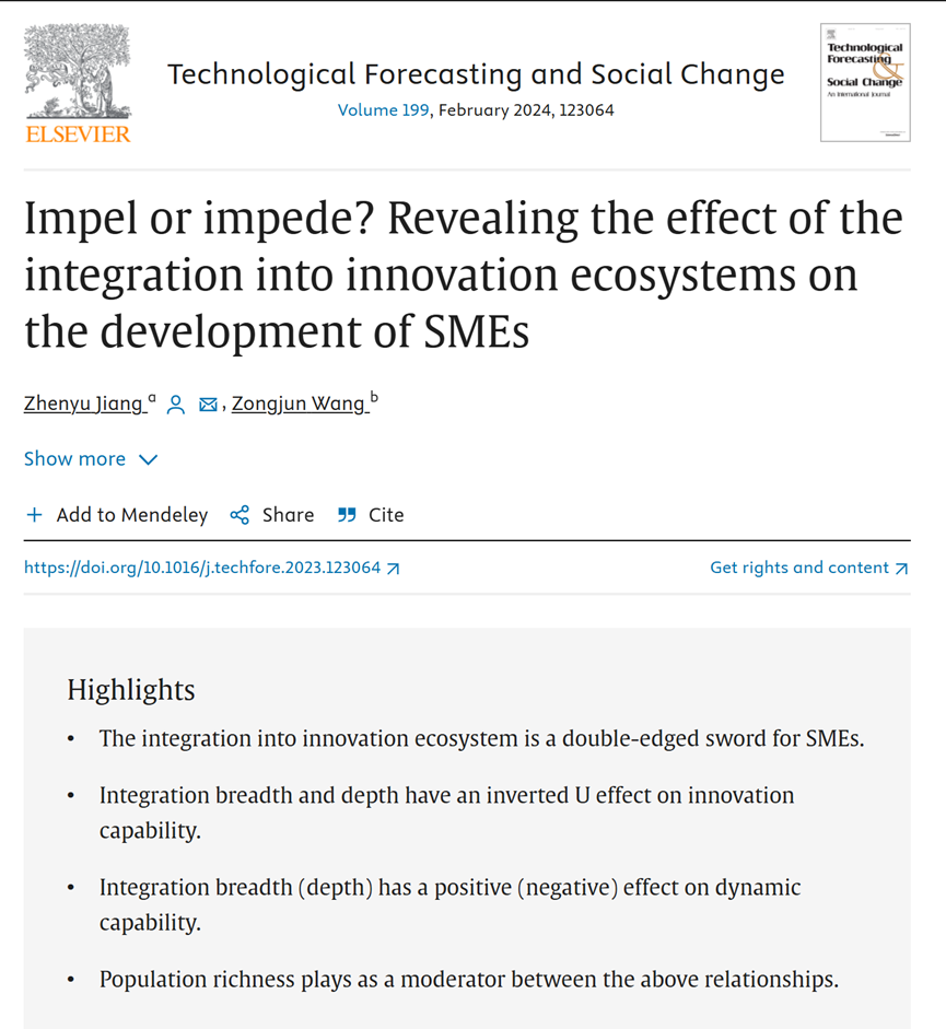 近日,国际权威期刊《Technological Forecasting and Social Change》正式刊发了新葡萄官网蒋振宇老师作为第一作者与合作者共同完成的论文“Impel or impede? Revealing the effect of the integration into innovation ecosystems on the development of SMEs”(推动还是阻碍?揭开创新生态系统融入对中小企业发展的影响)。