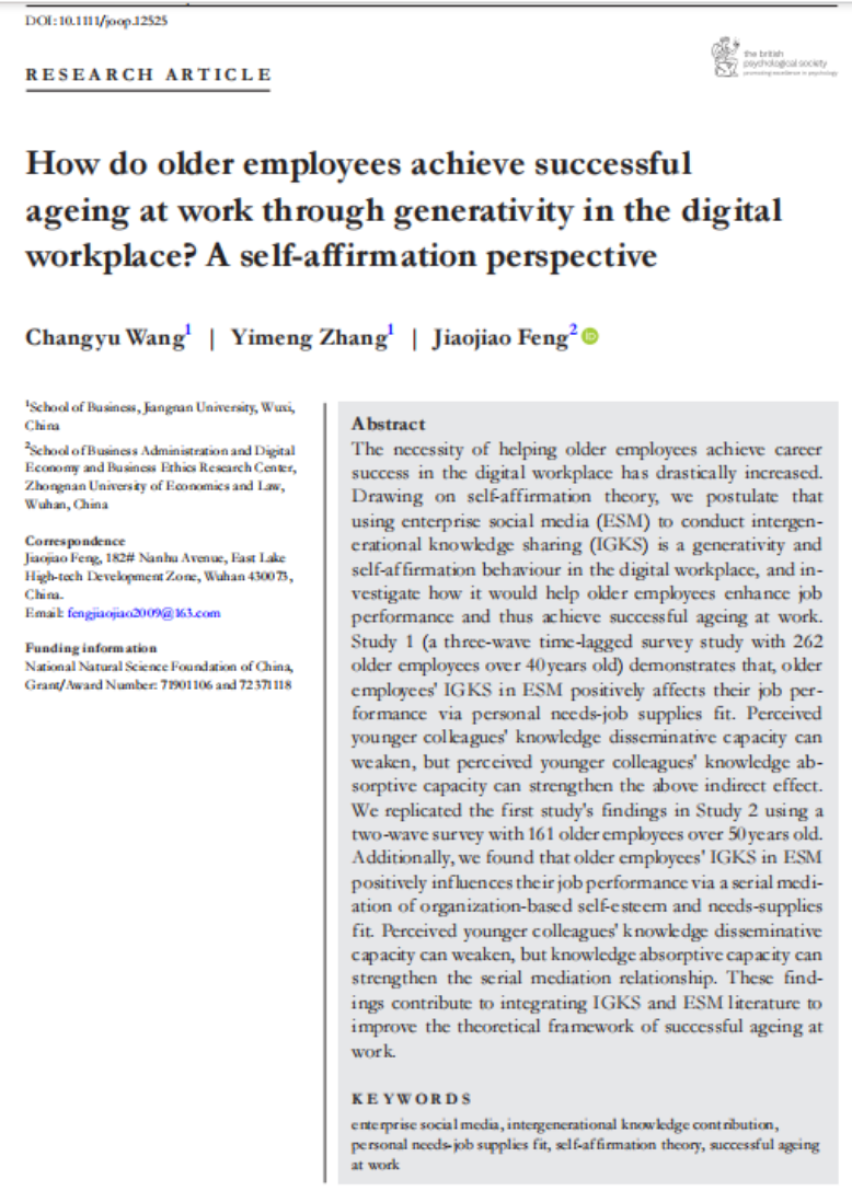 近期,国际权威期刊《Journal of Occupational and Organizational Psychology》在线发表了新葡萄官网汪长玉教授、新葡萄8883国际官网2022级硕士研究生张奕萌和中南财经政法大学冯娇娇副教授(通讯作者)共同完成的论文“How do older employees achieve successful ageing at work through generativity in the digital workplace? A self-affirmation perspective”。汪长玉教授为本研究的第一作者。