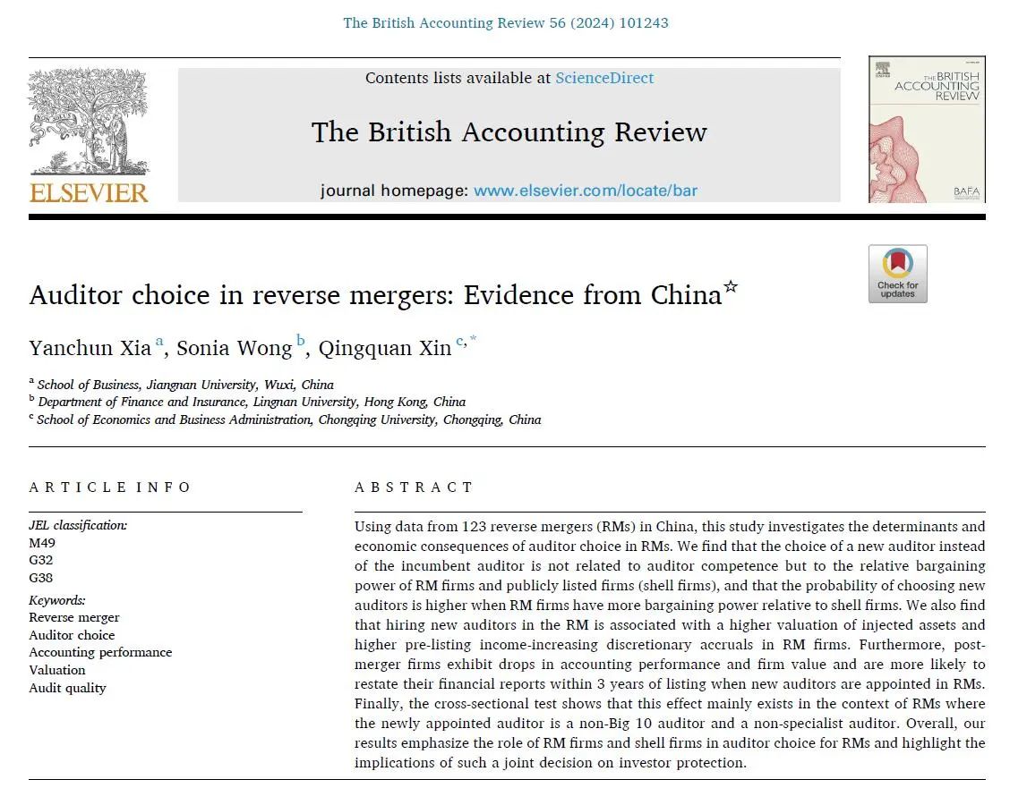 近期,国际权威期刊《The British Accounting Review》正式刊发了新葡萄官网夏艳春老师、岭南大学Sonia Wong教授和重庆大学辛清泉教授(通讯作者)共同完成的论文“Auditor choice in reverse mergers: Evidence from China”(借壳交易中的审计师选择:来自中国的证据)。夏艳春老师为本研究的第一作者。