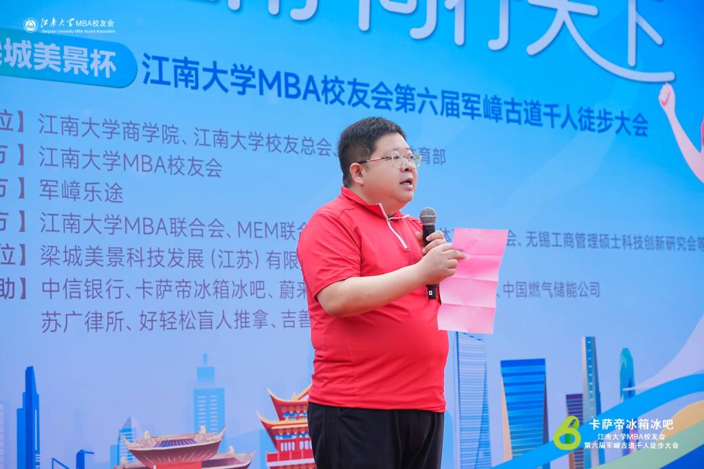 上午8时许,徒步大会开幕式正式开始,MBA2023级学生、MBA联合会副主席李岩主持开幕式。新葡萄8883国际官网党委书记刘长青致辞,刘书记表示在新中国成立75周年和奥运年举行徒步大会意义非凡,希望队员们在活动中以勇往直前、奋发向上、顽强拼搏的意志品质精神,在徒步锻炼中享受乐趣、增强体质、健全人格、锤炼品性。冠名赞助商梁城美景科技发展(江苏)有限公司品牌营销部崔鹏经理、连续两年支持活动的赞助商代表中信银行无锡分行副行长蔡映霞女士分别登台致辞。