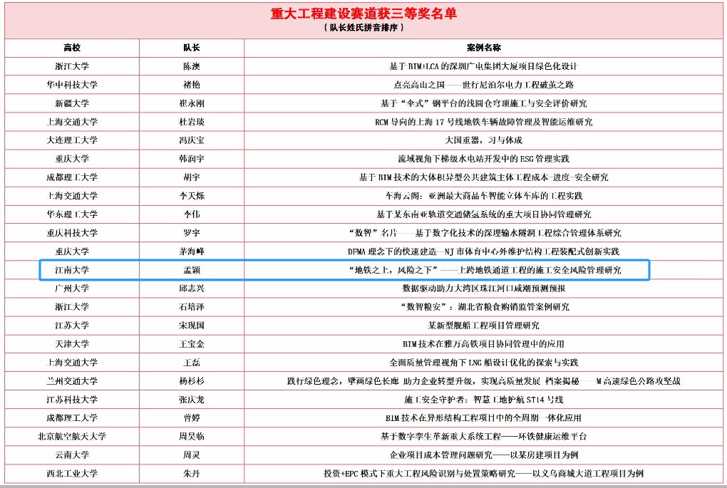 2024年10月26日至27日,第三届中国研究生工程管理案例大赛全国总决赛在北京圆满落幕。本次大赛由教育部学位管理与研究生教育司、全国工程管理专业学位研究生教育指导委员会联合指导,中国学位与研究生教育学会、中国科协青少年科技中心共同主办。经过激烈的角逐,新葡萄8883国际官网江南轨通智行队(指导老师:浦徐进、周亦宁;团队成员:何知、张国腾、孟颖、安楠、范进龙)凭借案例《“地铁之上,风险之下”——上跨地铁通道工程的施工安全风险管理研究》荣获重大工程建设赛道全国三等奖,展现了江南学子在工程管理领域的优秀才华和创新能力。